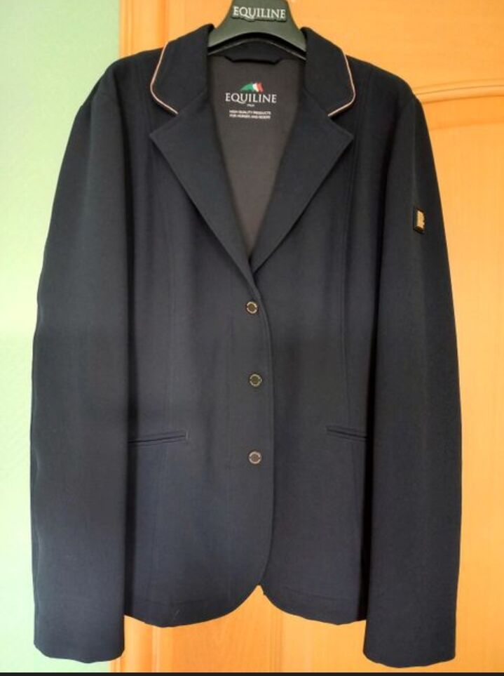 Neues, navy Turnierjacket der Marke Equiline für Mädchen/Damen in der Herstellergröße 14/15 years. Entspricht ungefähr der deutschen Kindergröße 170/176 bzw. der Damengröße 30/32. Chice Details in Rosegold. NP lag bei 200 €.