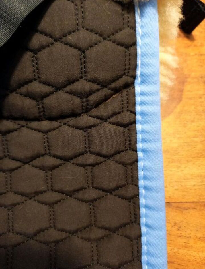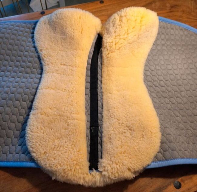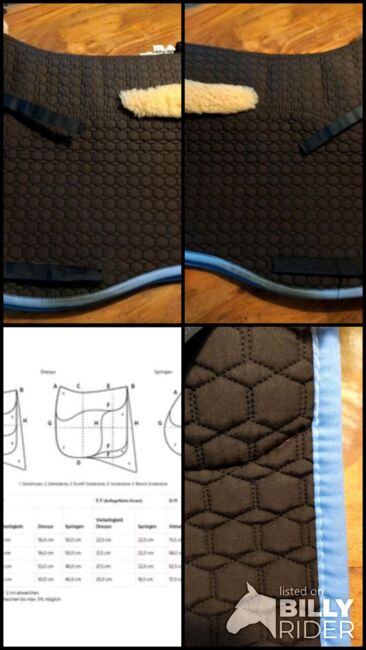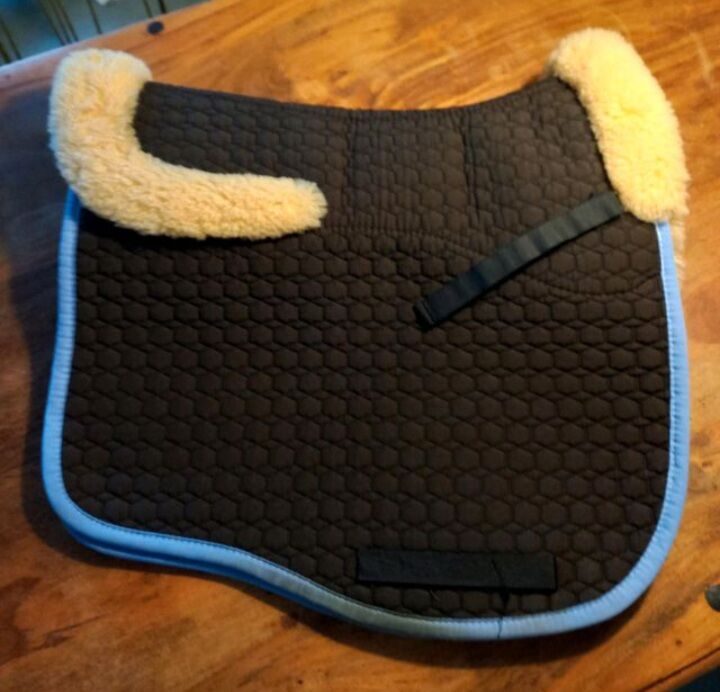 Echt-Lammfellschabracke Eurofit Dressur aus dem Hause Mattes in Größe L (Maße siehe Foto). Die Farbe ist ein ganz dunkles Braun, die Einfassung Hellblau. Das Lammfell: Natur. Keine Mängel. NP lag bei 200 €.