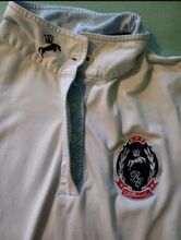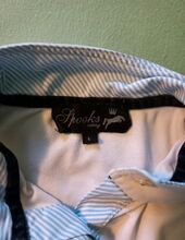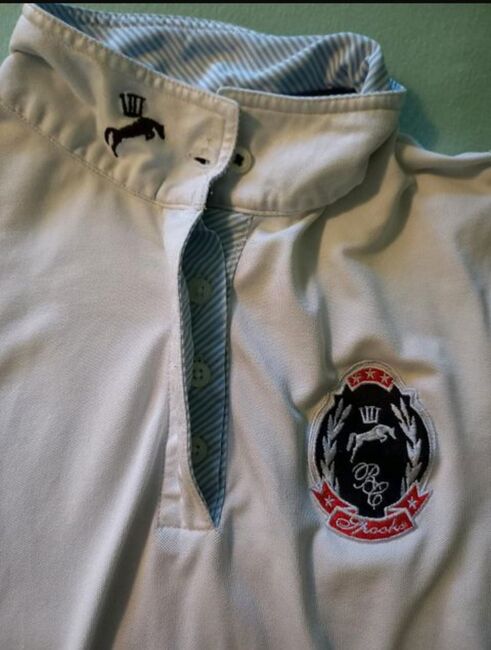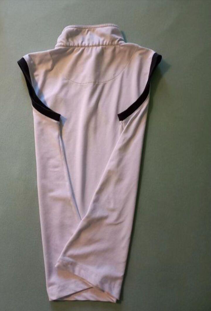 Sehr gut erhaltenes, ärmelloses Turniershirt der Marke Spooks in Weiß, Größe L. Material ist strechig. Mit zugedeckter Knopfleiste. Verstärkte, strechige Bündchen an den Armabschlüssen. Bereit für eine weitere Runde!