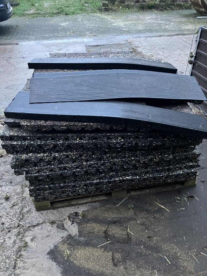 Die Matten waren 2 Jahre in Gebrauch. Verkauft werden sie mit 4 m Gummirampe zum Kantenschutz und einigen Reststücken ca.50x50cm. Jede Matte wiegt ca. 30kg.