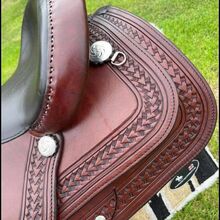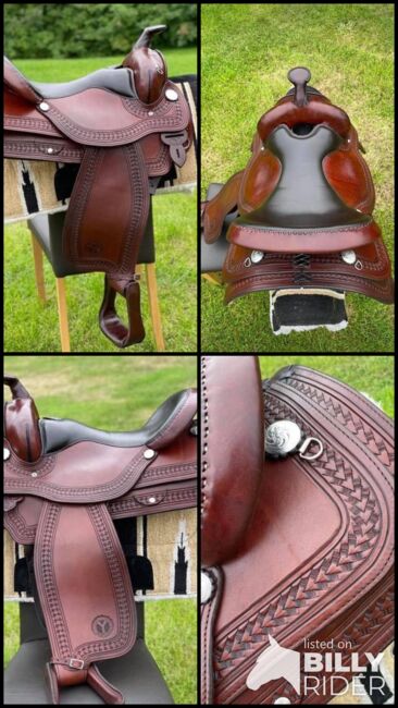 Wunderschöner 16" Westernsattel, bereit für Ausritte oder den Reitplatz! Dieser Sattel besticht durch hochwertiges, dunkelbraunes Leder mit aufwendiger Punzierung, die ihn zu einem echten Blickfang macht. Der Sitz ist bequem und gut gepolstert, ideal auch für längere Ritte.