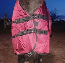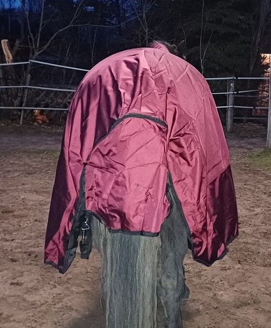 Regendecke mit 50g, gern gekauft im Winter als auch bei Starkregen oder zugigen Stallungen, durch den tiefsitzenden Schweißlatz fällt sie ca. 10cm länger aus, eng anliegender hochgezogener Highneck, passt auch Pferden mit breitem Hengsthals, im Herbstangebot statt 169,90€ für je 99,00€.