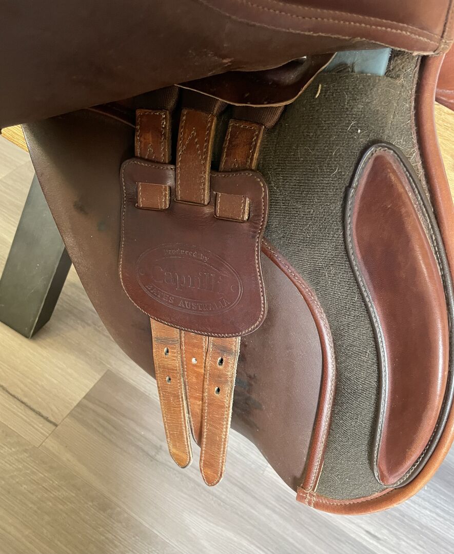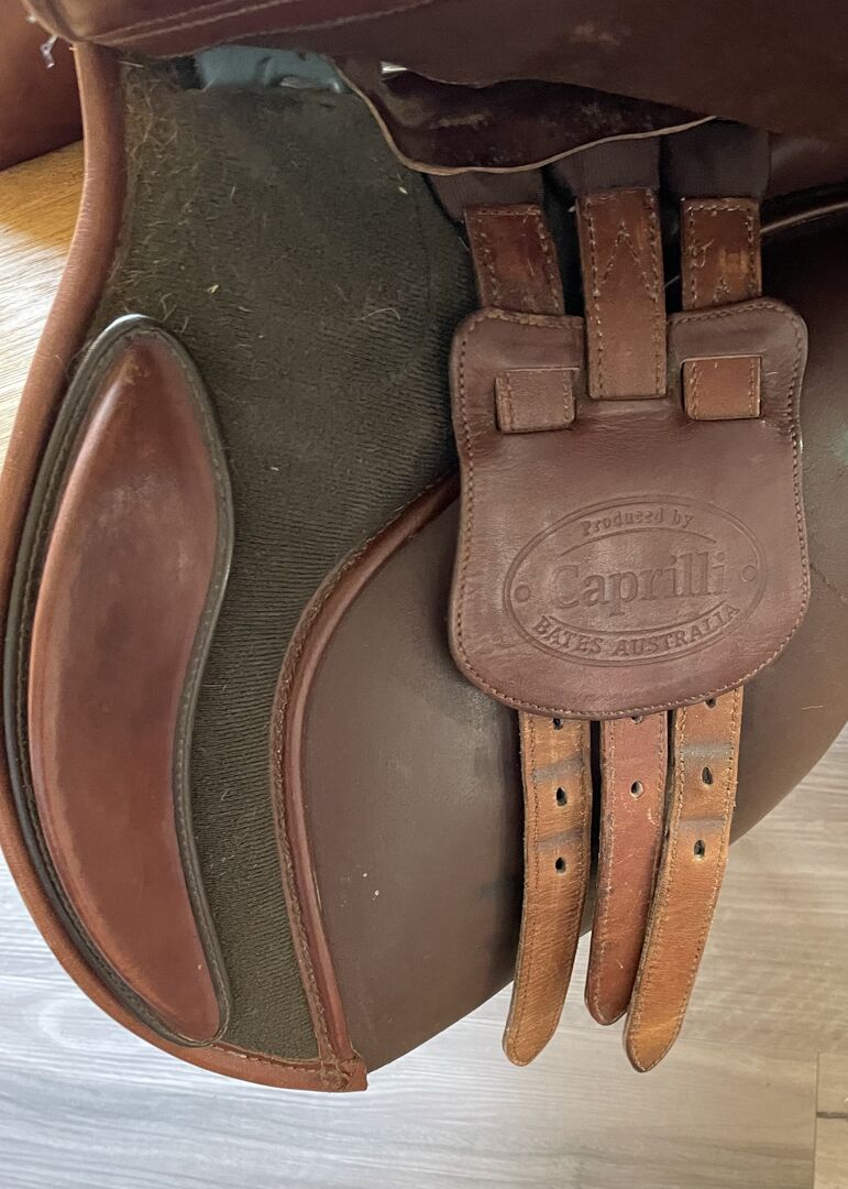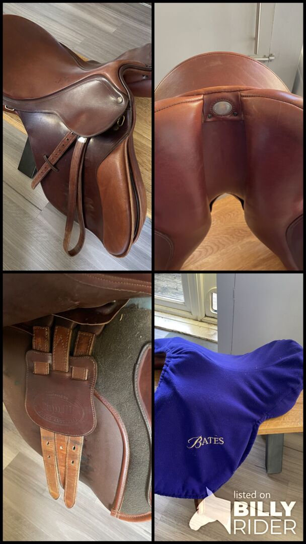 Schöne gut gepflegt Bates Caprilli "cair" System Springsattel mit passenden Steigbügelriemen und Satteldecke . verstellbare Kopfeisen - hat derzeit eine breite (schwarz) Kopfeisen, aber ich habe auch eine schmale (rot), wenn nötig . Kürzlich von unserem Sattler überprüft . Verstellbare Kniepauschen . Kann auf Kosten des Käufers verschickt oder vor Ort abgeholt werden