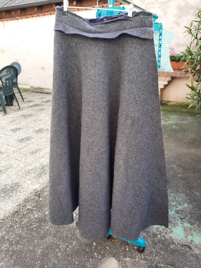 Reitrock in Wollfilz aussen Grau und innen lila Länge 114 cm .