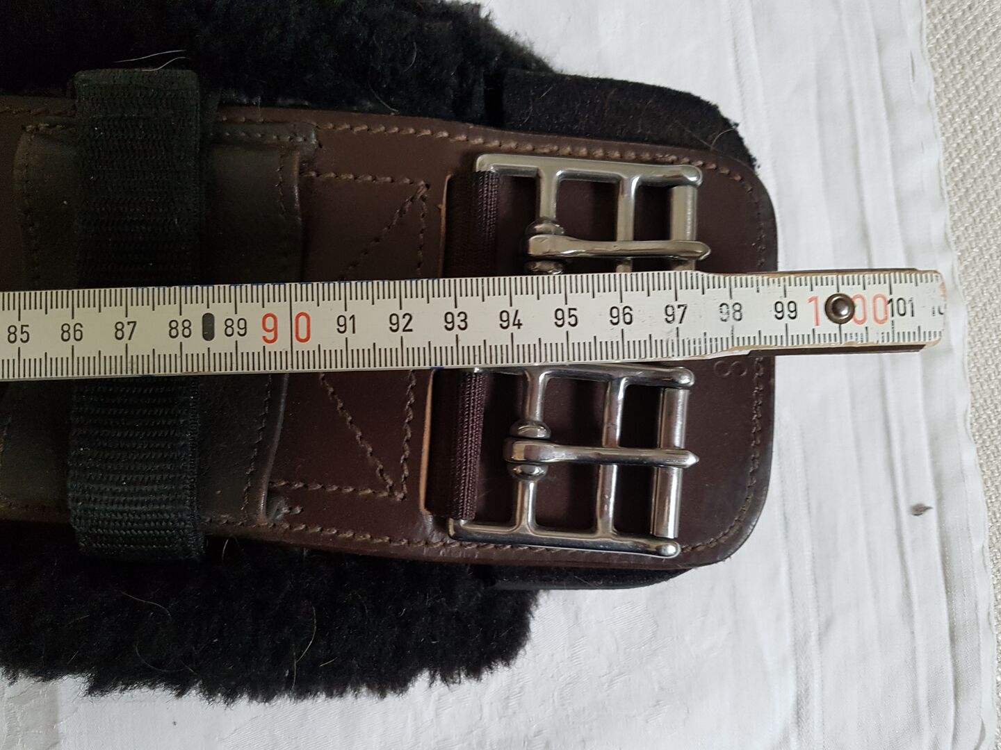 Shoulder Relief Girth – Modell AUSSIE & TRAIL, gebraucht, aber sehr gut erhalten. Länge ca. 96 cm. Enorme Schulterfreiheit. Zwei verschiedene Bezüge, Neopren und schwarzes Kodelfleece. Befestigung Neopren durch Klett. Achtung: Der Fleeceliner war etwas zu kurz, daher wurde mit dem Neopren-Liner gestückelt. Funktion dadurch nicht beeinträchtigt, nur verbessert. Bei Fragen hierzu gerne melden. Fleece wurde gewaschen, dann nur 2x kurz benutzt, daher sind noch einige Haare daran.