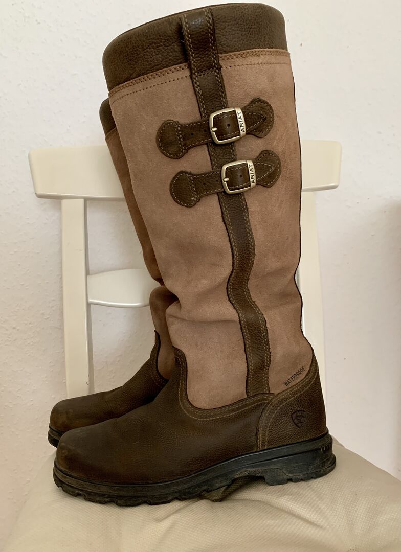 Gut erhaltener Outdoor- und Reitstiefel von Ariat, Modell Eskdale. Der Stiefel ist wasserdicht und hat eine super bequemes Fußbett. Der Neupreis liegt bei 220€. Mängel an den Fußspitzen, siehe Fotos!