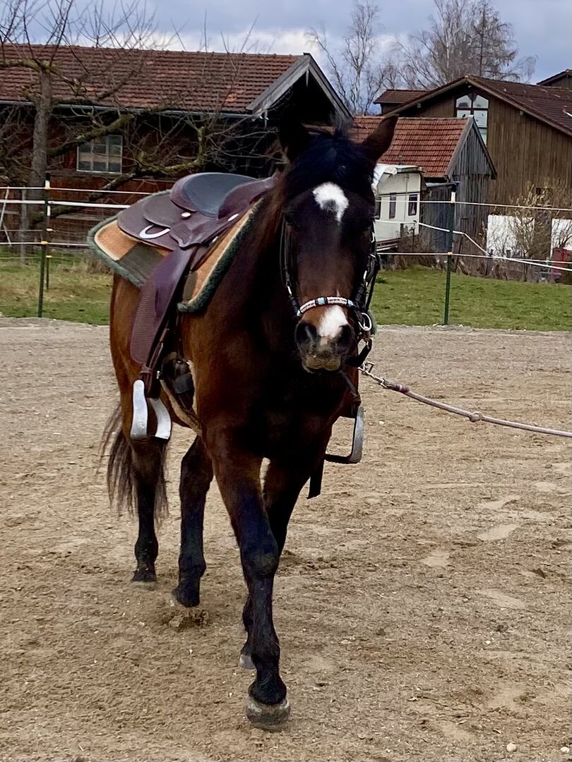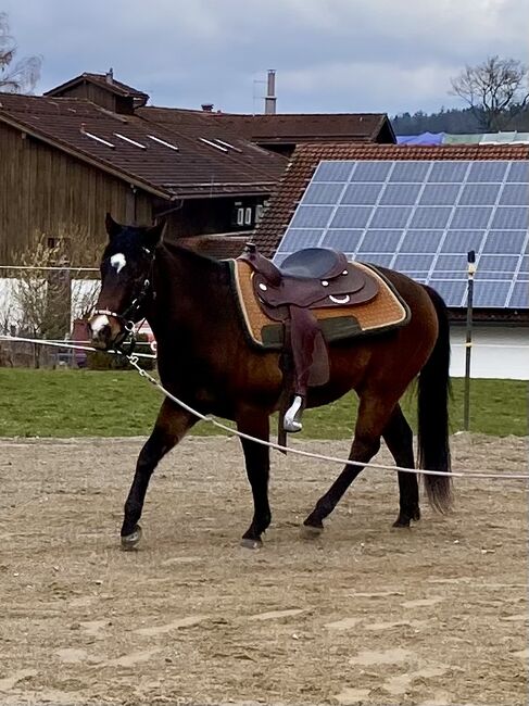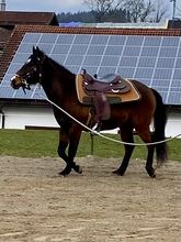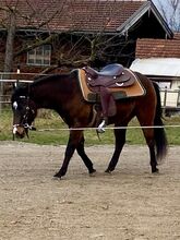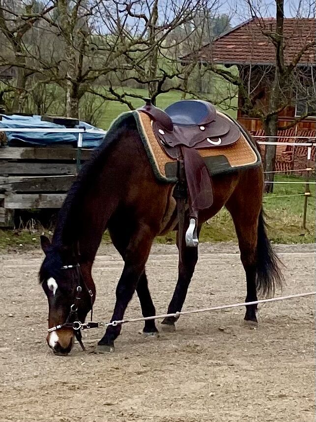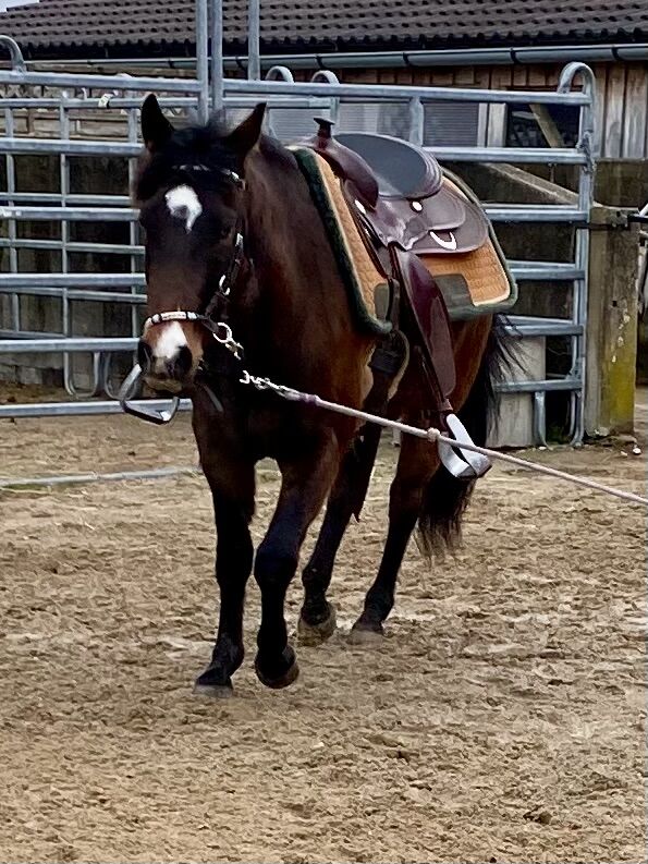 Er liebt Spaziergänge, Bodenarbeit, kennt den Sattel und geht bereits toll an der Longe.