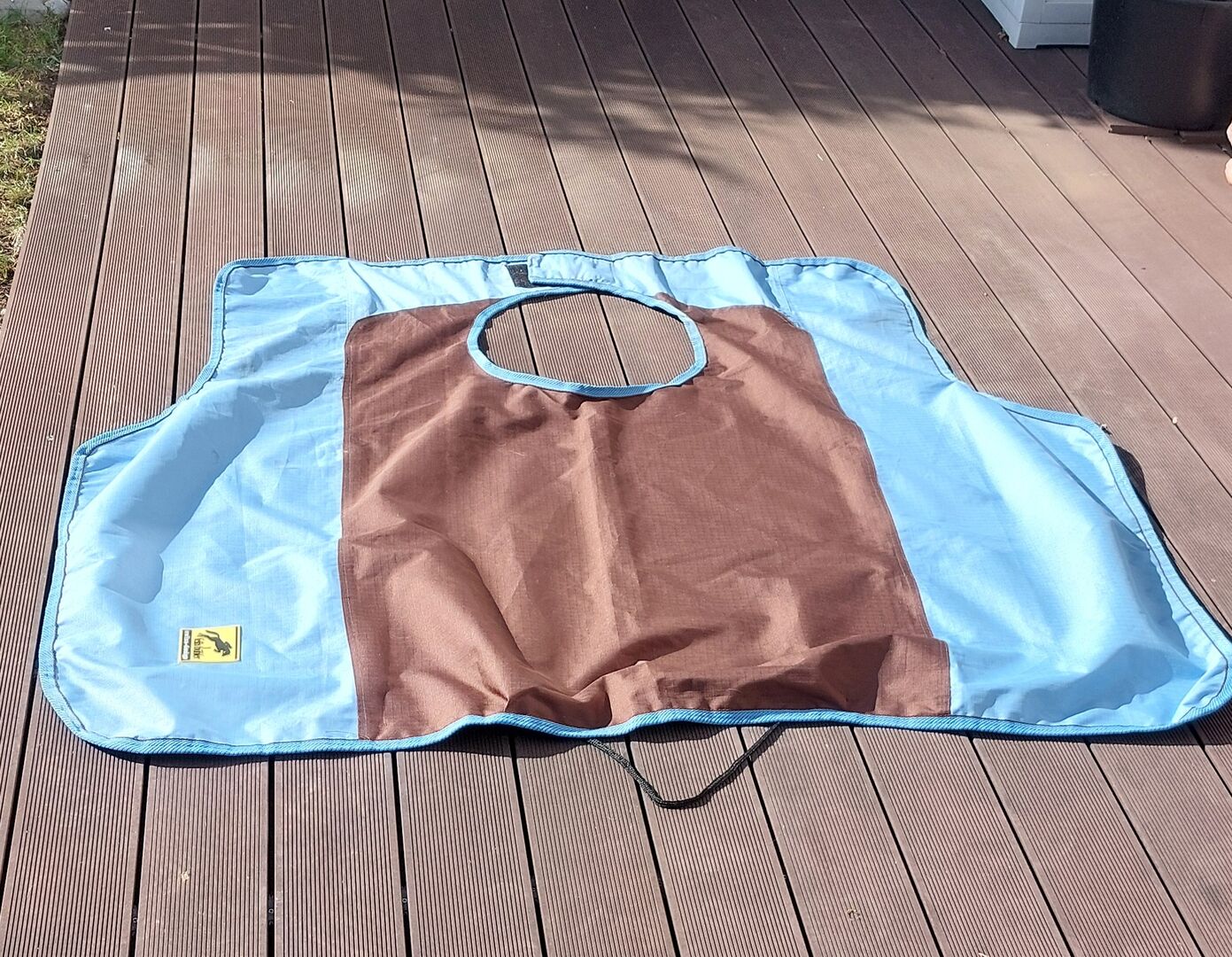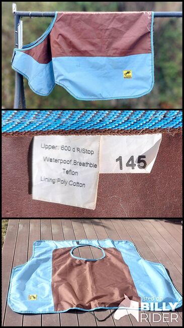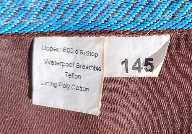 Die Außenhaut der Decke besteht aus wasserdichtem und atmungsaktivem 600 Denier Ripstop Teflon. Wasserdicht, atmungsaktiv, mit Poly-Cotton unterlegt. Zum Schutz des Pferdes während des Ausrittes an nassen Tagen. Aufgrund des Schnittes kann man gut mit dem Bein ans Pferd kommen, so dass immer ein direkter Schenkelkontakt zum Pferd möglich ist. Ohne Beschädigungen.