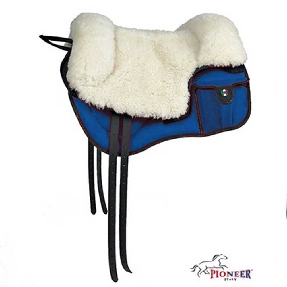 Das Bareback Reitpad mit Schafswolle von Pioneer besitzt ein eingebautes AirMesh Material, wodurch eine effektive Belüftung des Pferderückens erfolgt. Es besteht aus Neopren. Durch die Bewegungsfreiheit werden die Muskeln besser bewegt und gleichermaßen der Vorgang des Abschwitzens wesentlich erleichtert. Durch die gewebte Schafswolle auf der Sitzfläche hat der Reiter einen sehr komfortablem Sitz.Satteltaschen ermöglichen die Mitnahme von kleinen DIngen. Das Pad hat Billets aus Biotane und Ringe aus Messing für Steigbügelriemen eingebaut. Zum festhalten gibt es einen praktischen Griff. Farben