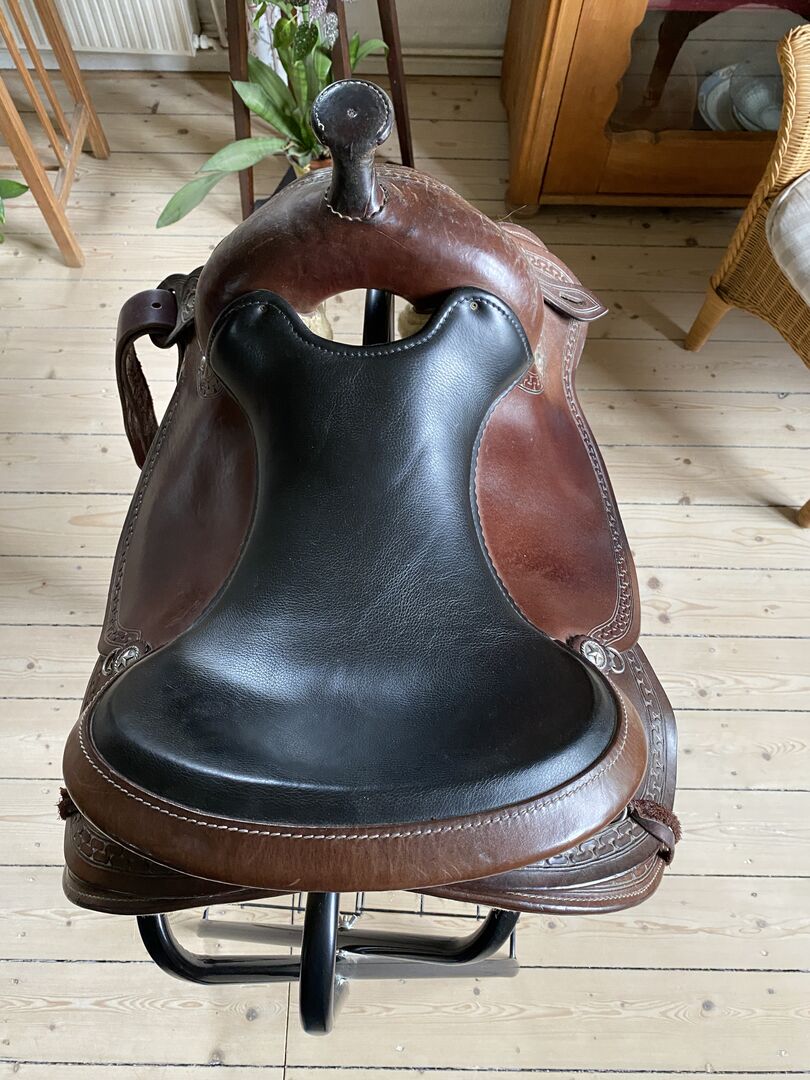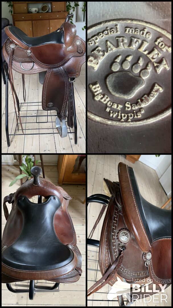 Westernsattel der Marke Bearflex (ähnlich equiflex) ,auf verschiedene Pferdetypen einstellbar, passt sich gut dem Pferderücken an, erst 4 Jahre alt, Sitzgröße 16 inch, Abstand zwischen den Conchos ca. 20 cm, Gesamtlänge des Sattel ist 60 cm, d.h. auch für sehr kurze Pferde geeignet.