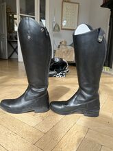 Diese hohen schönen und sehr bequemen weichen schwarzen Kunstleder Reitstiefel haben ein paar Mal getragen worden, sind aber immer noch in gutem Zustand. Sie sind flexibel um den Knöchel, wenn nicht auf, aber wenn Sie reiten, fühlen sie sich super stabil und sicher. Der Reißverschluss auf der Rückseite erleichtert das An- und Ausziehen. Mit einem breiteren Zehenbereich, sind sie perfekt für diejenigen mit breiteren Füßen. Es gibt ein paar kleine Gebrauchsspuren, die aber kaum auffallen und weder das Aussehen noch die Leistung der Stiefel beeinträchtigen. Online-Preis für neu ist £71.