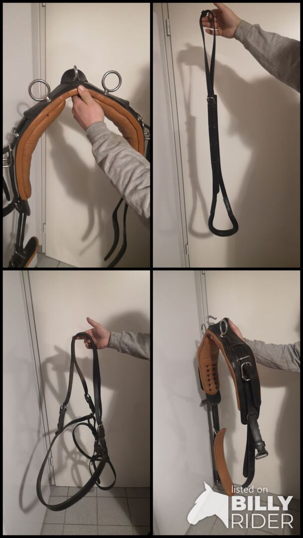 Das Geschirr Besteht aus dem Brustblatt mit Zugsträngen, Selet, Kopf Gestell, Schweifriemen und Hintergeschirr + Leinen. Das Geschirr ist Schwarz mit Braun Unterlegt
