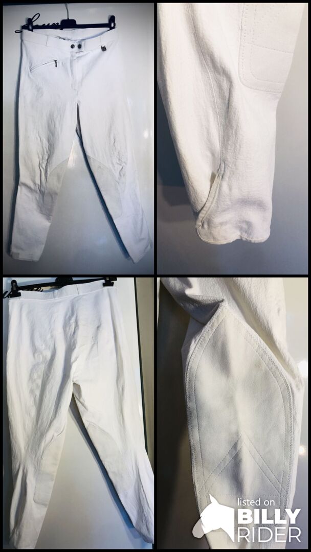 Durch das lederähnliche Material hat man einen sehr guten Halt im Sattel. Die Stellen an den Knien sind typisch und entstehen nach ein par mal tragen der Reithose, kein Schmutz. Ansonsten sehr guter gebrauchter Zustand. RVs und Saum alle in Ordnung. Da es eine weiße gebrauchte Reithose ist, sind geringfügige Gebrauchsspuren zu erwarten. Die Bilder geben den allgemeinen Zustand jedoch sehr gut wider.