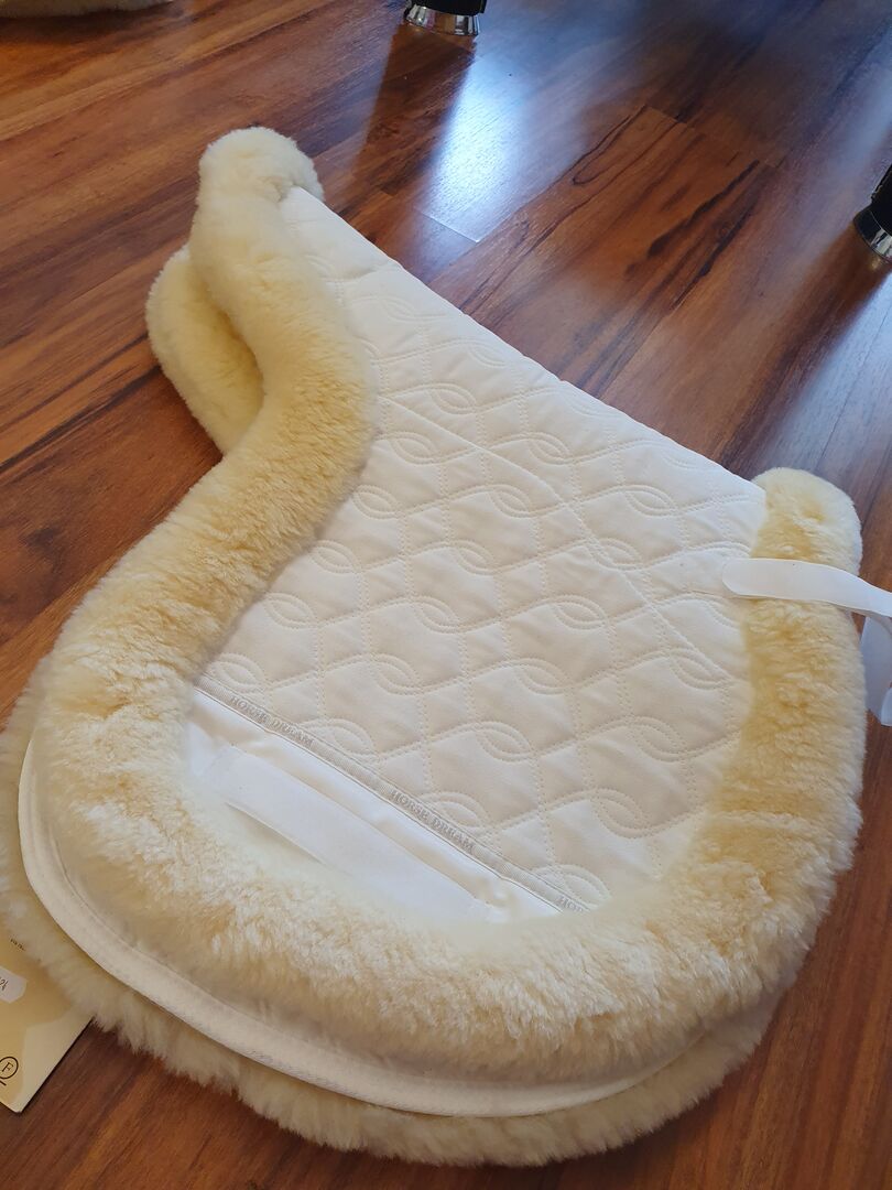 Verkaufe hier eine unbenutzte Satteldecke von Christ Horsedream in der Größe Springen. Sie war nie am Pferd, weist aber ganz geringe Lagerspuren auf. Sie hat auf der Oberseite einen schicken komplett umlaufenden Fellkranz, die Unterseite ist mit Teilfell im Rückenbereich besetzt. Das Fell ist naturfarben. Der Neupreis liegt bei rund 150 Euro.