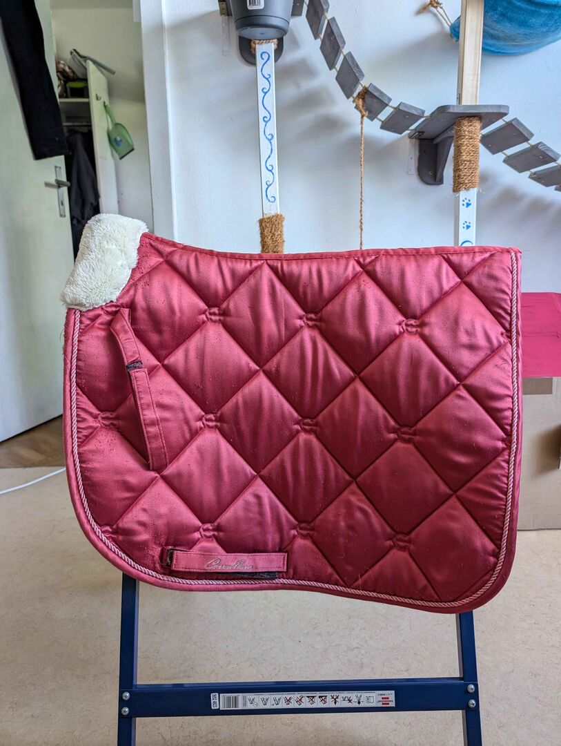 Gebrauchte Dressurschabracke mit einigen Abriebspuren, die jedoch nicht großartig auffallen mit Sattel.