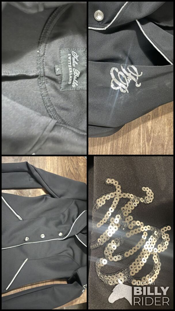 Gr L, 2xgetragen, schwarz, neuwertig, mit Glitzer Pailletten auf dem linken Oberarm, vorne Silber eingefasst, Silberknöpfe 2 seitliche Taschen mit Reißverschluss, sehr bequemes dehnbares Material