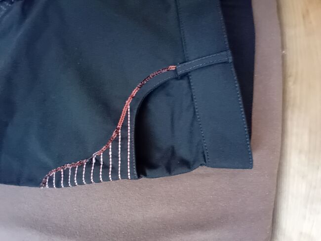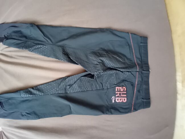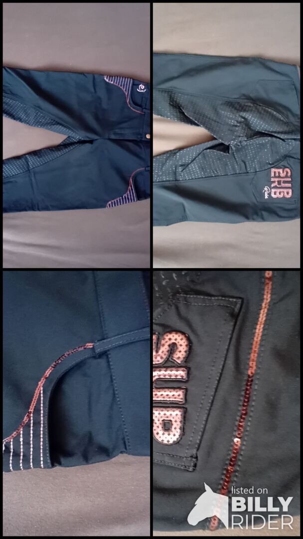 eine leichte sommerreithose mit rosegoldenen applikationen. nicht getragen - nagelneu. fällt extrem klein aus. würde sagen, wie größe 38 oder 40.