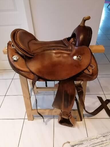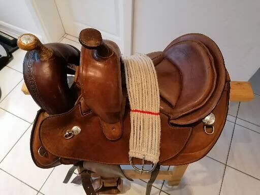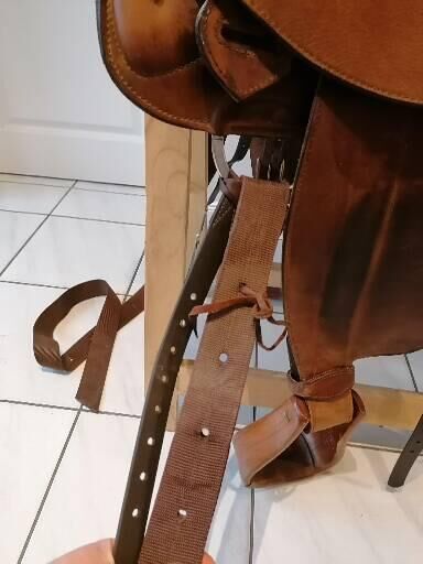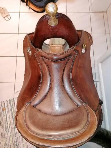Verbaut ist momentan ein 4er Fork, ich habe aber wie auf den Bildern zusehen, auch ein 3er Fork, welches optional noch von mir ausgetauscht werden kann. Ich selber habe den Sattel etwas umfunktioniert und auf jeder Seite zwei Gurtstrupfen angebracht, sodass man den Sattel etwas weiter hinten und eben an zwei Stellen ("V Gurtung") mit einem "Englisch" Gurt befestigen kann. So saß er auf meinem kurzen Übermaßpony besser. Die ursprüngliche Gurtungsmethode ist aber innerhalb von 2 Minuten wieder angebaut und man kann wie gewohnt den "western" Gurt anbringen. Ich habe den Sattel selten für lange Ritte benutzt, eher kurze Einheiten. Dennoch hat er mit der Zeit seine Gebrauchsspuren.