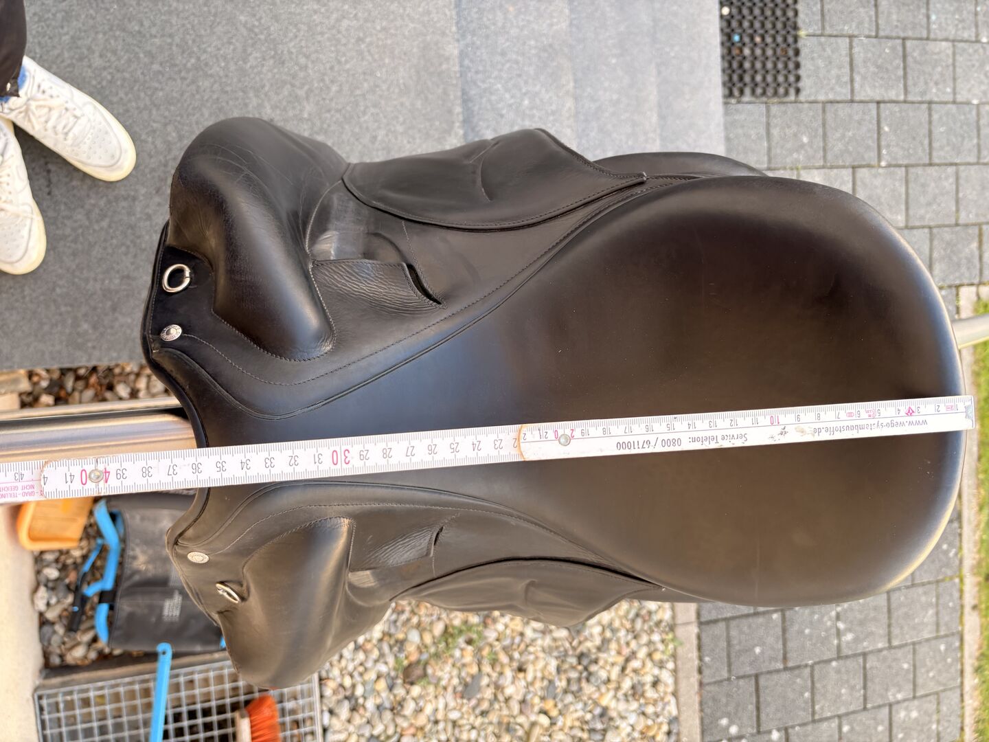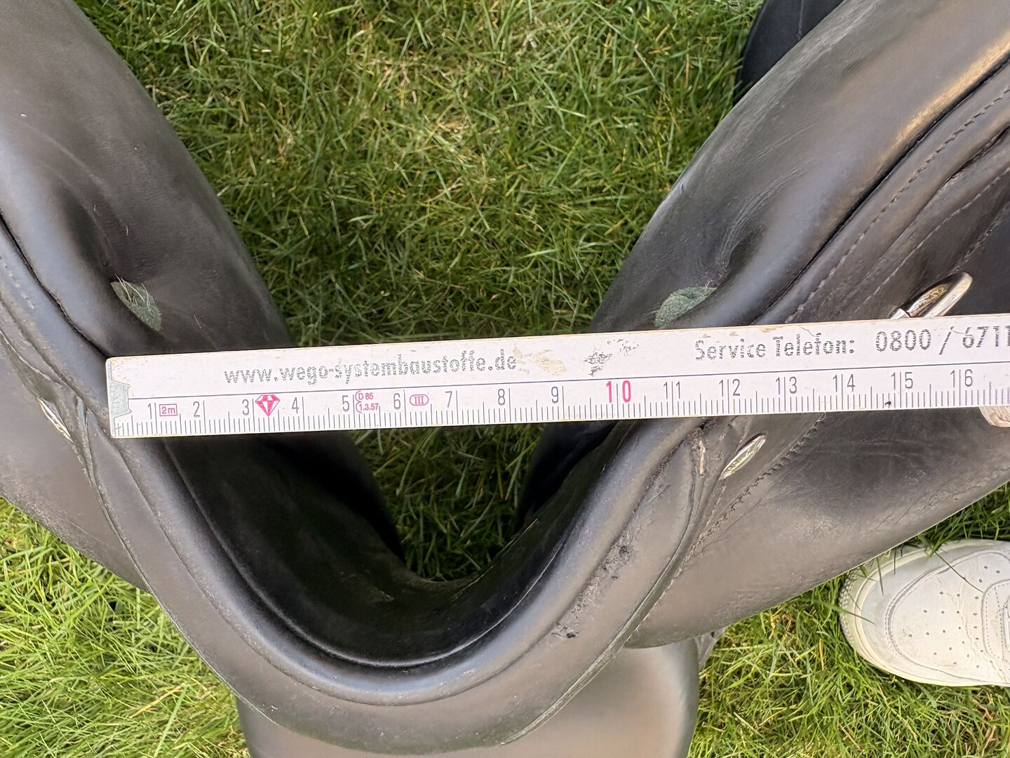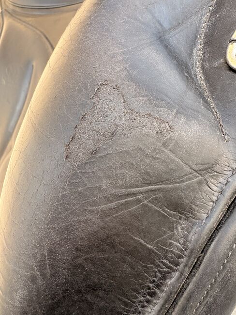 Der Sattel wurde stets pfleglich behandelt und regelmäßig gereinigt. Normale Gebrauchsspuren sind vorhanden, und eine leichte Beschädigung.