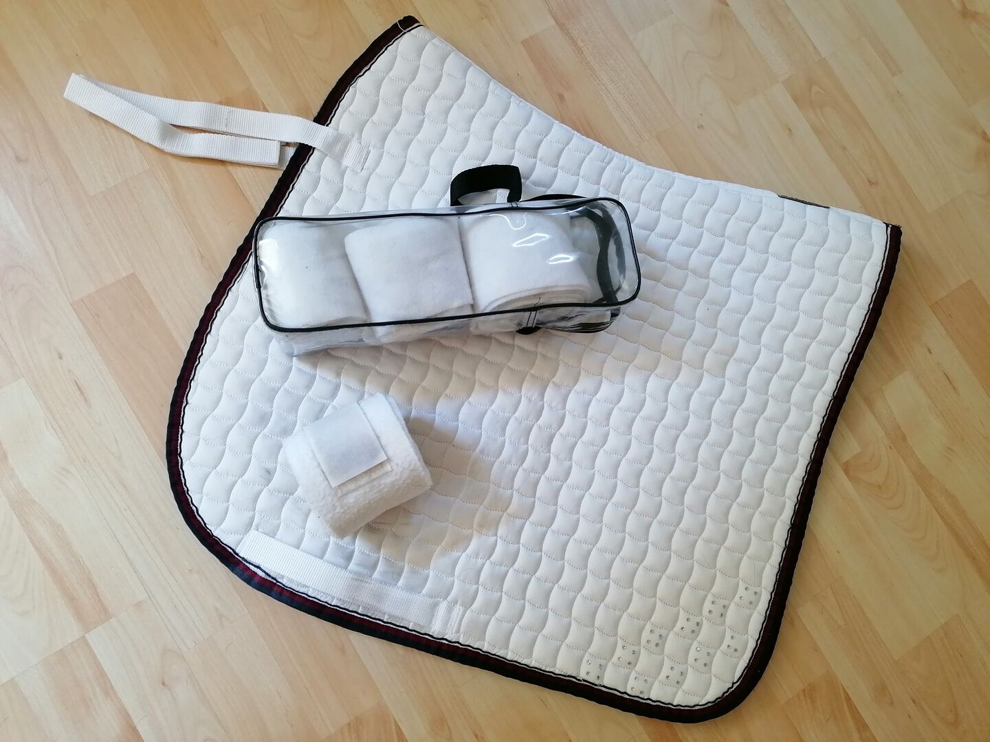 Weiße Dressur Schabracke mit 4 passenden Bandagen