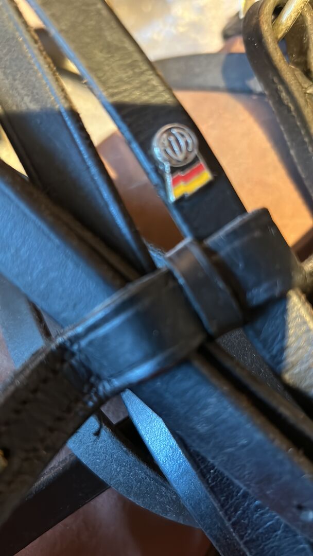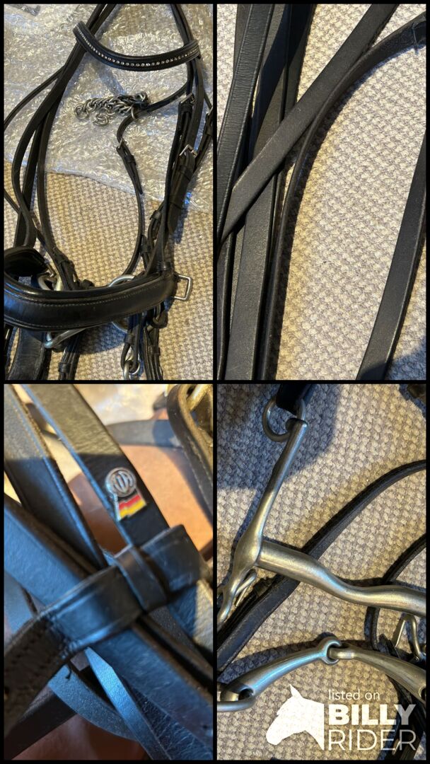 Die Kürbisse haben eine Weite von 13,5 cm. Angeboten wird komplett: Zaum, Gebisse, Kinnkette, drei Paar Zügel