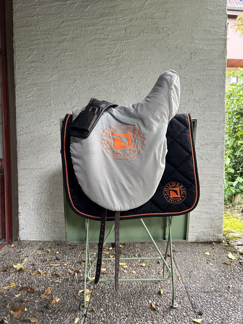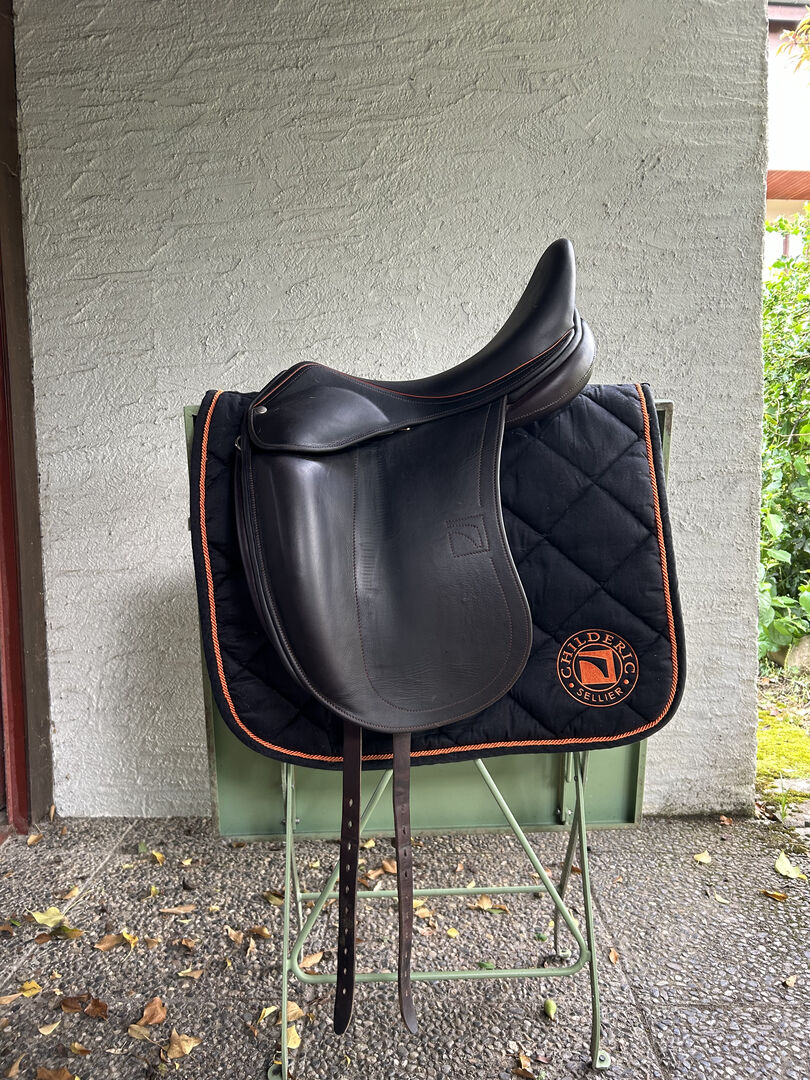 Dressursattel der französischen Qualitätsmarke Luc Childeric. Der bequeme Sattel ermöglicht einen nahen Sitz am Pferd und die Lederqualität unterstützt gute Haftung und tiefen Sitz.