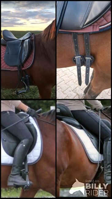 Tiefer Sitz Leder schwarz doubliert Klettpauschen Lange Gurtstrippen Grossflächige Sattelkissen französische Form mit Trapezmuskelentlastung Füllung mit Naturfaser Kalt stufenfrei verstellbare Kammerweite viel Platz für die Schulter durch eingesenktes Kopfeisen Hergestellt in Deutschland Baujahr 2016 Sitzgrösse 18,5 Zoll aktuelle Kammerweite ca. 32.