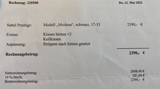Der Sattel wird erst versandt, wenn der Kaufpreis (Sattel + Sattelkarton + Versand) vom Käufer überwiesen wurde. Die Zahlung des Gesamtbetrages kann per Banküberweisung oder PayPal erfolgen. Der Versand erfolgt in 3-4 Werktagen nach Zahlungseingang. Der Sattel kann nach Vorabsprache im Münchner Raum Probe geritten werden.