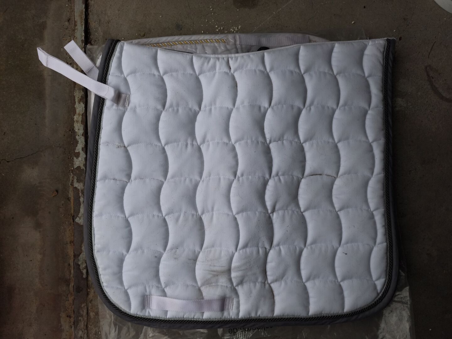Schöne Turnierschabracke DL von Esperado, weiß mit grauer Einfassung und silberner Kordel. Sattel hat etwas abgefärbt, sonst aber keine Flecken oder Abnutzungen