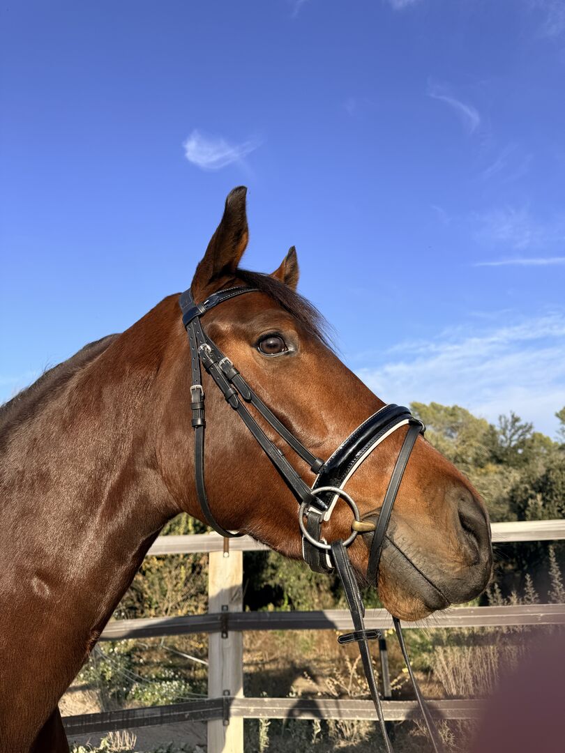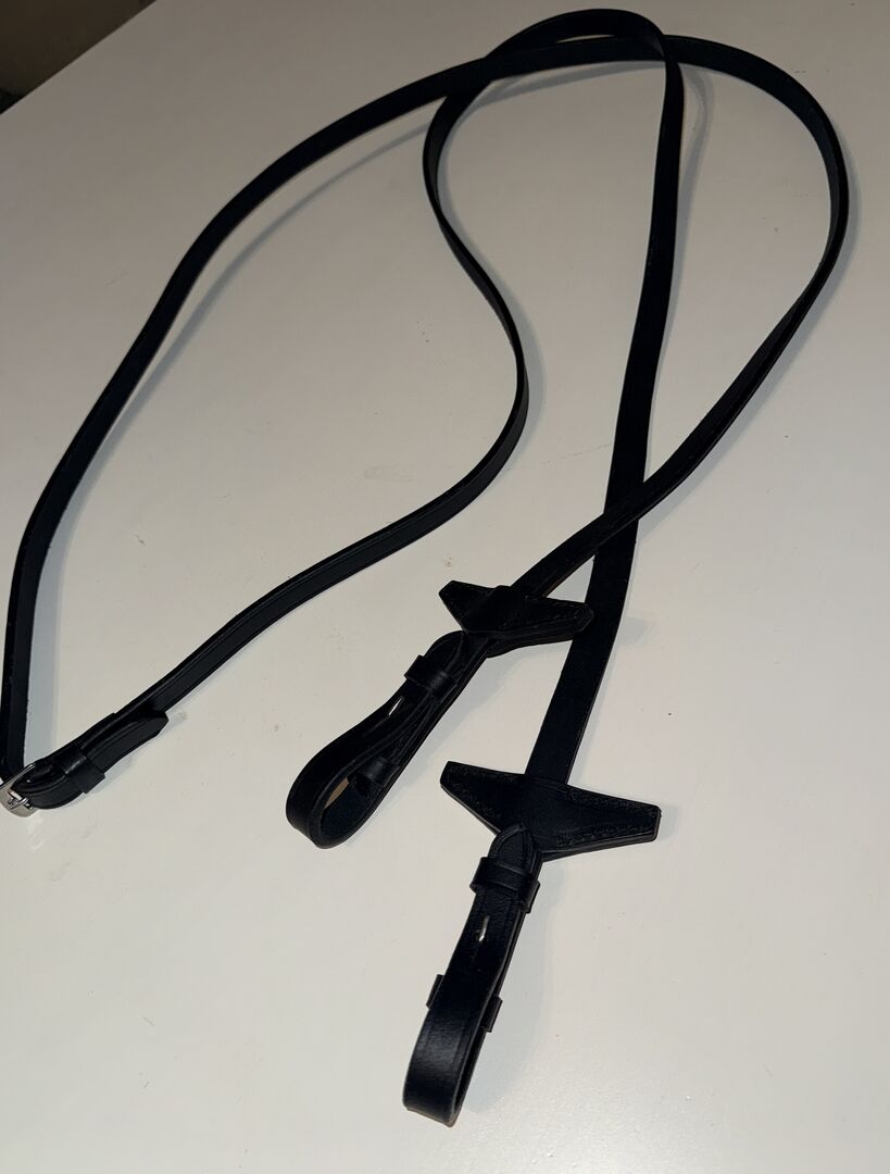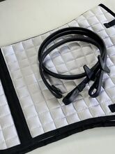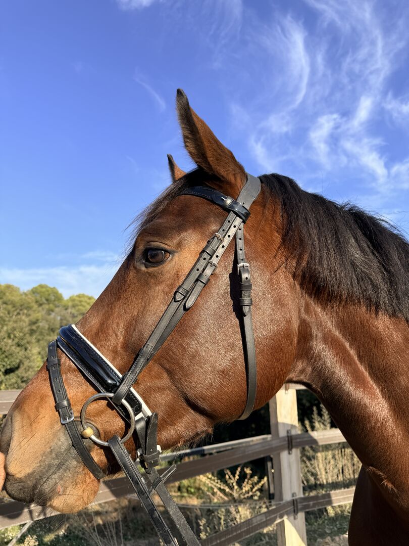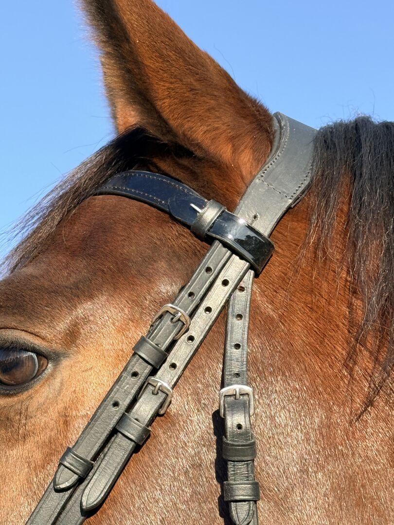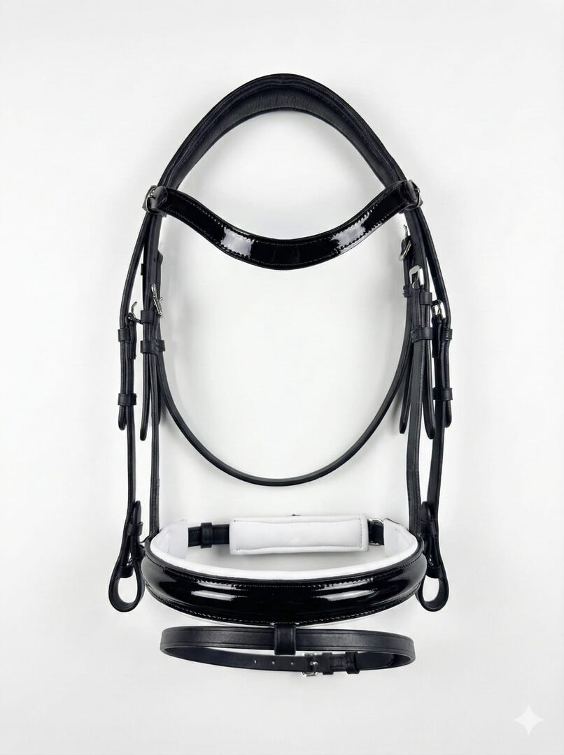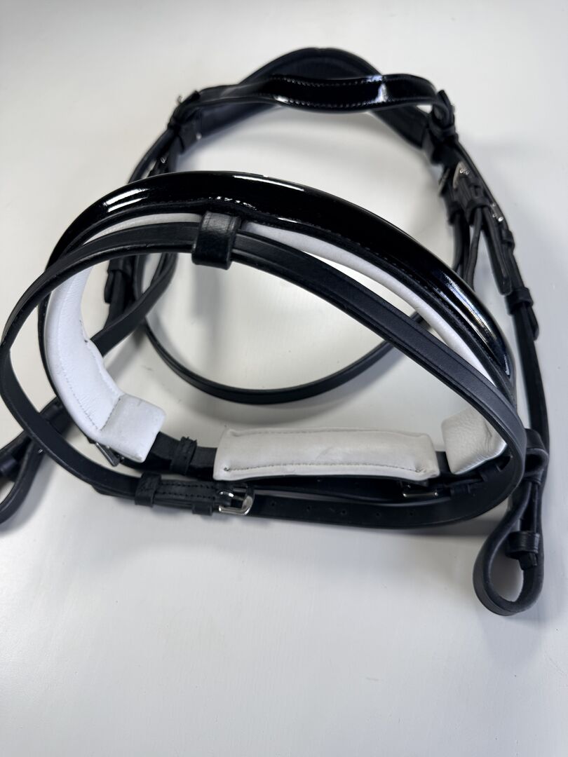 Dressurzaum Verni Premium - Muserolle Doublée Blanche + Rênes - Premium LD-Black Dressurzaum aus Leder mit schwarzem Glanz. Entworfen für maximalen Komfort auf dem Pferd und Eleganz auf der Strecke.
