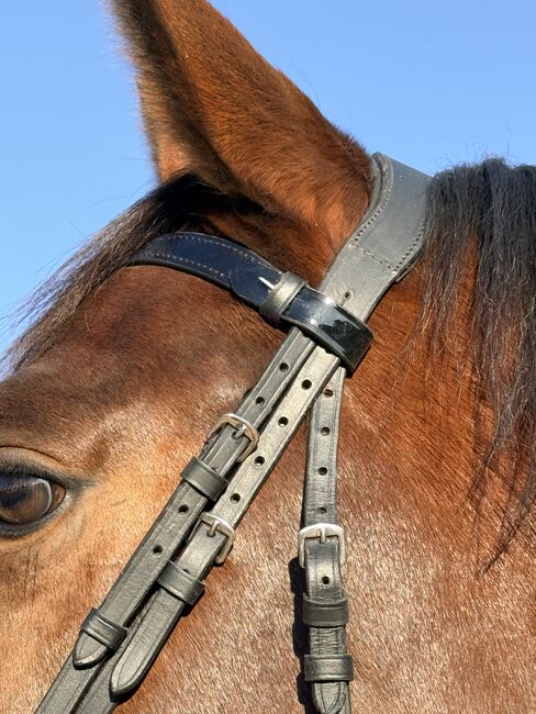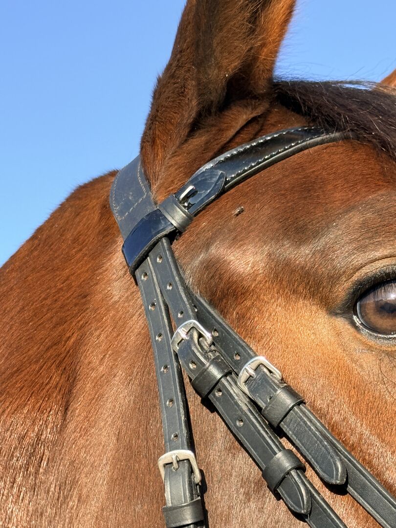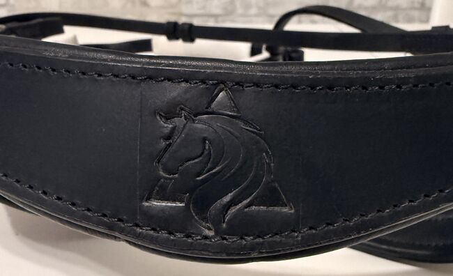 Der breite Nasenriemen ist vollständig mit weichem und verstärktem weißem Leder unterlegt und schützt so das Genick und den Nacken vor Druckstellen und Reibung.