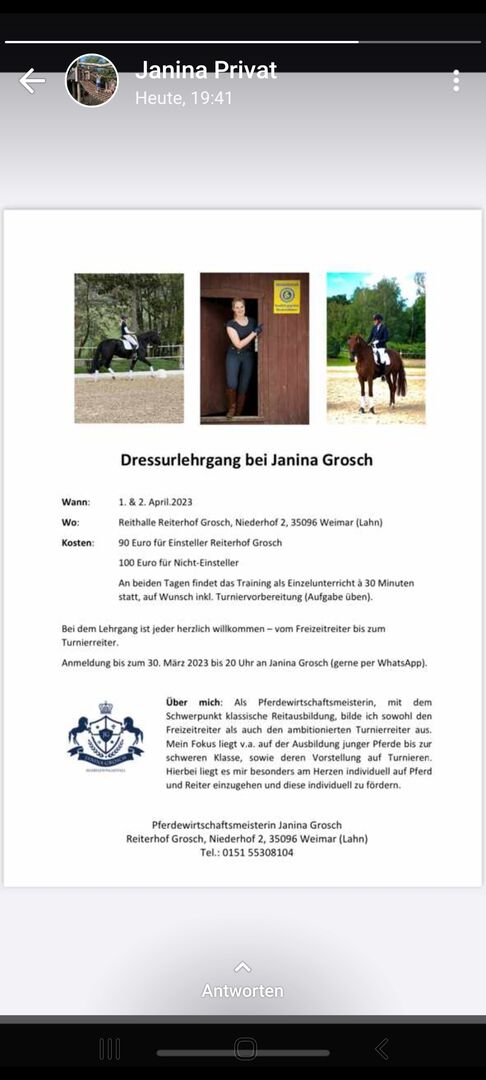 Am 1 und d 2 April findet ein Dressurlehrgang in Weimar Nesselbrunn mit Janina Grosch statt.Bei Intresse gerne melden ein paar Plätze sind noch frei.