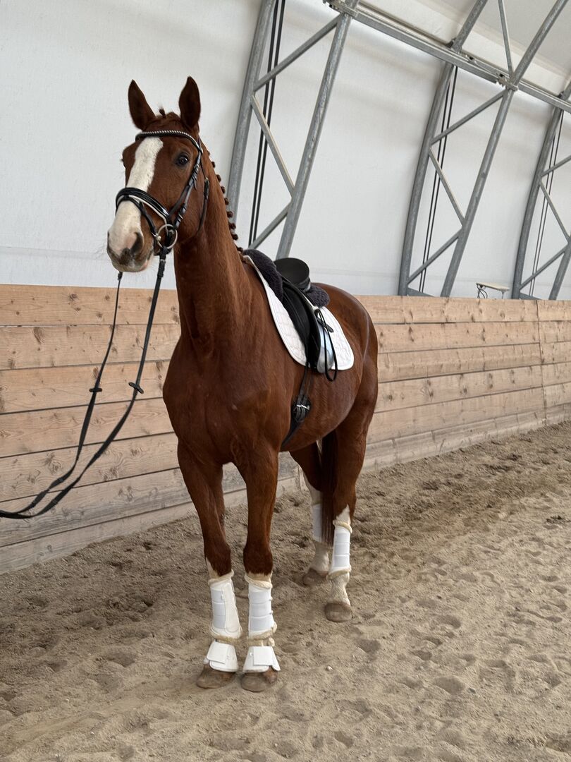 Bernstein (von uns Börni genannt) ist ein schicker Fuchswallach, der 2016 geboren ist. Er hat ein Stockmass von 1,75 und 3 gute, leichtfüssige Grundgangarten. Börni ist momentan Dressurpferde A fertig ausgebildet. Mit L- Lektionen haben wir begonnen und diese meistert er mit bravour. Er wird solide ausgebildet und wird bei weiterer Arbeit sicherlich ein toller Partner für die höhere Dressur werden. Er kennt Cavaletti und Stangenarbeit und ist auch schon kleinere Parcourauschnitte bis 100cm gesprungen. Aufgrund seiner Arbeits- einstellung macht ihm dies auch Spass. Ein Ritt ins Gelände stellt kein Problem dar. Allerdings ist er kein Anfängerpferd und braucht einen sicheren Reiter. Im Umgang ist er super brav, kennt Kinder, Hunde, Traktoren und grössere Gerätschaften, da er auf einem landwirt- schaftlichen Betrieb steht. Er steht bei uns 24/7 auf der Weide (wenn es das Wetter zulässt) ansonsten ist er Boxenhaltung gewöhnt. Wir würden uns allerdings einen Platz mit viel Weide wünschen, da er einfach ausgeglichener ist und gerne mit seinen Artgenossen Zeit verbringt und im Herdenverband auch gemischt sehr verträglich ist. Wir wünschen uns für Börni ein liebevolles Zuhause an dem seine Fähigkeiten und Fertigkeiten weiter gefördert werden. Probereiten ist nach Vereinbarung jederzeit möglich! Videos können auf Wunsch geschickt werden. Egger Laura 0664/2520137