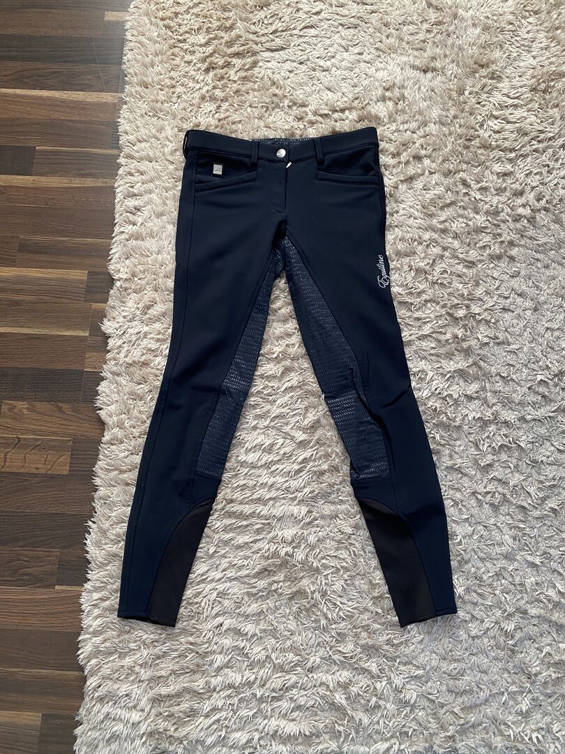 Verkaufe wunderschöne dunkelblaue Equiline-Winterreithose mit Vollgrip-Besatz in der Größe 38. Die Hose fällt jedoch etwas kleiner aus - eher wie 36. Die Innenseiten sind mit kuscheligem Fleece gefüttert. Die Hose hat einen elastischen Beinabschluss. Am rechten Bein löst sich an einer kleinen Stelle eine Naht. Bezahlung per PayPal möglich. Privatverkauf: Der Verkauf erfolgt unter Ausschluss jeglicher Sachmangelhaftung und ohne Rücknahme