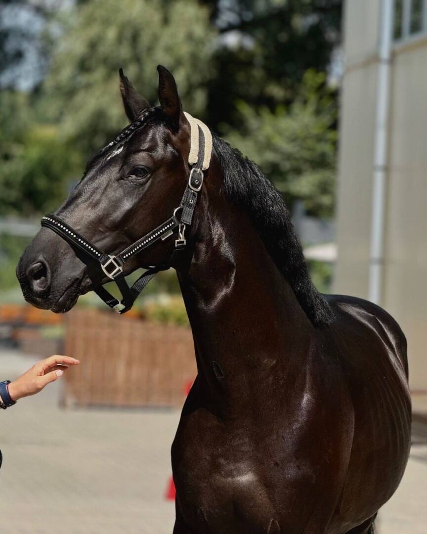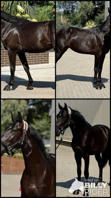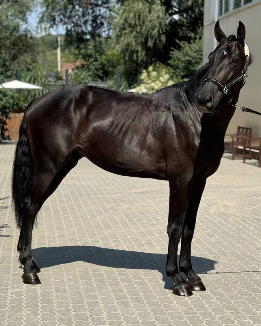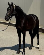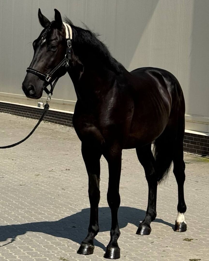 Diese beeindruckende 5-jährige Stute mit einem Stockmaß von ca. 165 cm überzeugt durch ihre elegante Erscheinung, ihren athletischen Körperbau und ihr auffälliges dunkles Fell mit wunderschönem Glanz.