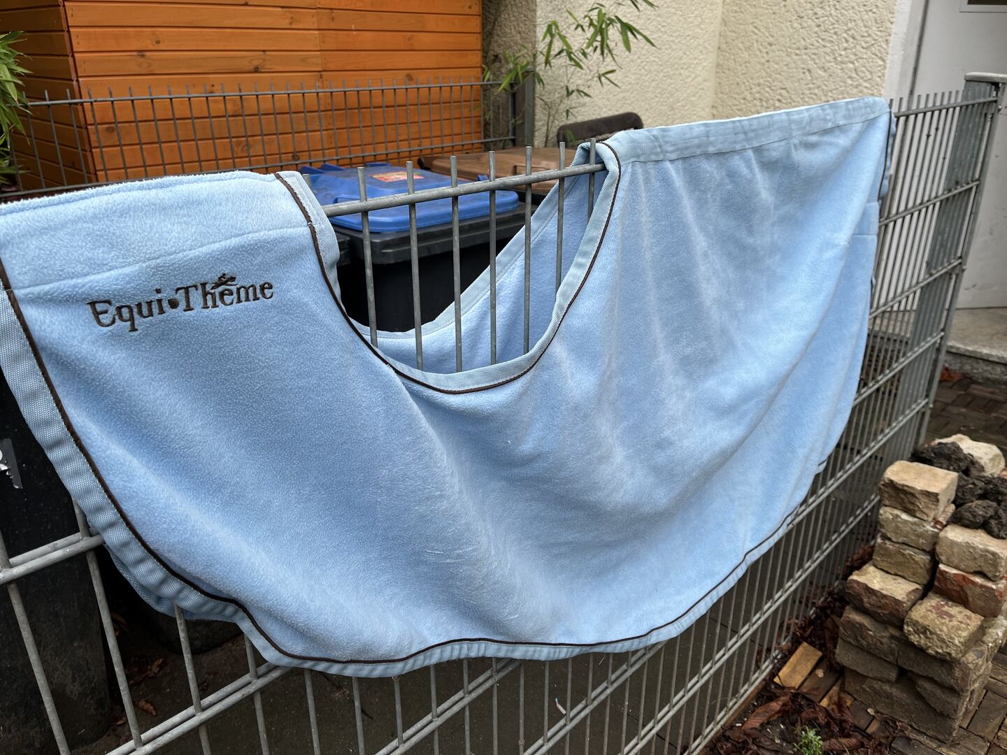 Sehr schöne babyblaue Abschwitzdecke aus kuscheligem Anti-Pilling-Fleece mit Sattelausschnitt. Transportiert die Feuchtigkeit zuverlässig vom Körper des Pferdes weg. Mit Klettverschluss vor dem Sattel/auf dem Widerrist. 100 % Polyester.