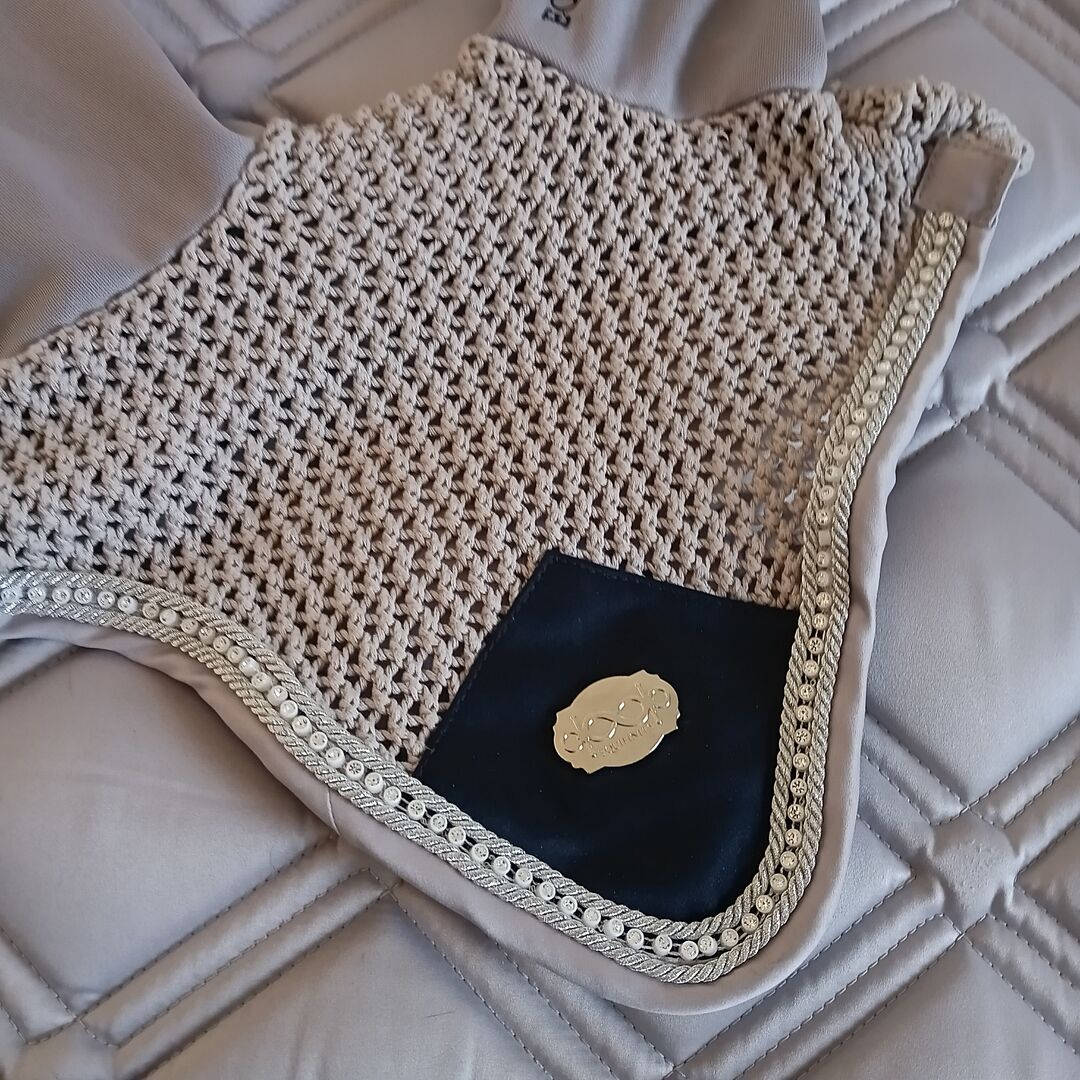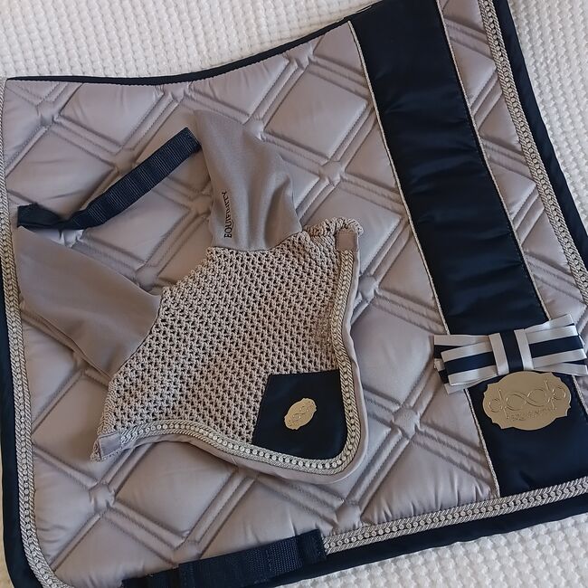 Sehr schöne Schabracke mit Glitzersteinen. Sehr gut im täglichen Gebrauch mit Klettverschluss um die Gurtstrippen. Frisch gereinigt, ganz wenig benutzt, deshalb fast wie neu. Dazu passende Fliegenhaube mit Glitzersteinen. Sehr gute Qualität. Kann im Set als auch einzeln gekauft werden. Preis ist für das Set ohne Lieferkosten. Gerne kann ich die Sachen auch verschicken, dann kämen noch die DHL Versandkosten dazu