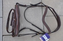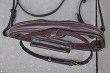 Trensenzaum aus Büffelleder mit breitem anatomischen Genickstück, "V"-förmiges Stirnband, kombiniertes Reithalfter mit Rindsleder weich unterlegt.