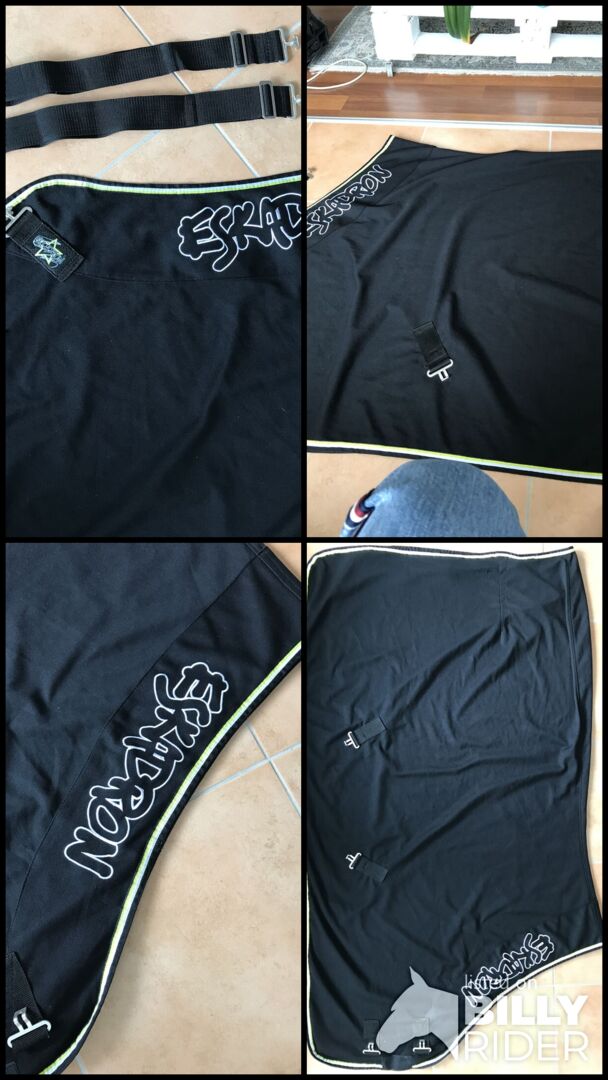 Schöne leichte Abschwitzdecke besonders für Sommer oder Übergangszeit geeignet. Sie hat besonders gute Trocknungseigenschaften. Auch als leichte Aufwärmdecke für die Führanlage bestens geeignet. Sehr guter Zustand, der Schweifriemen ist sauber und die T-Verschlüsse tadellos. Sie wurde vielleicht 3 x benutzt, da sie unserem Pferdchen zu klein ist
