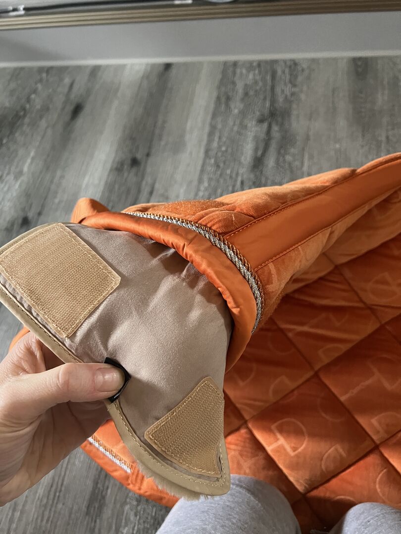 Verkaufe eine gebrauchte aber dennoch in super Zustand befindliche Schabracke von Eskadron. Es handelt sich um die Velvet stamp in der Farbe vermillion orange. Sie hat einen schönen Fellrand am Widerrist, welcher auch abgenommen werden kann, da dies bloß mit Klett fest ist. An der Schabracke selbst befindet sich der flauschige Teil vom Klett. Ich habe sie gerne genutzt, dennoch ist sie nicht verformt, nicht plattgedrückt und der Samtbezug ist auch nicht abgenutzt. Lediglich ganz minimale Sattelflecken in Gurtlage hat sie, welche man aber erst beim genauen Hinschauen erkennt. Die Schabracke ist super dick gepolstert und der Sattel kann auf dem Samt auch nicht rutschen. Verkauft wird sie nur, da ich sie schon länger nicht genutzt habe und ich auch einfach zu viel habe.