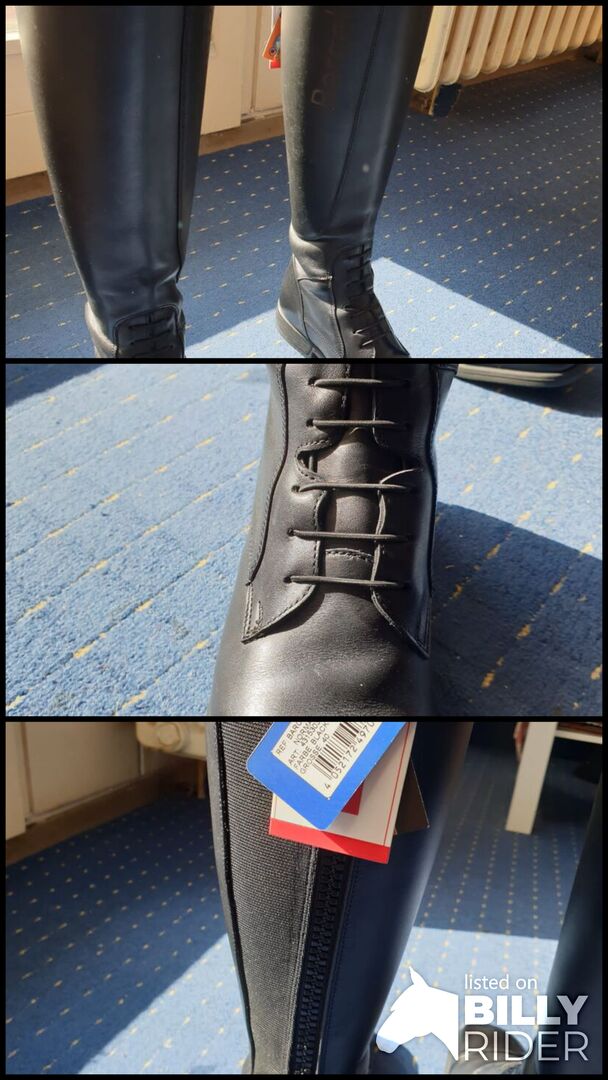Biete neue Lederreitstiefel Gr.40 Stiefel sind Schwarz Stiefel hab ich im Laden und 1x Hause anprobiert. Wade :Normal Gesamthöhe: 54,5 cm Mit Karton und Orginalpreisschild