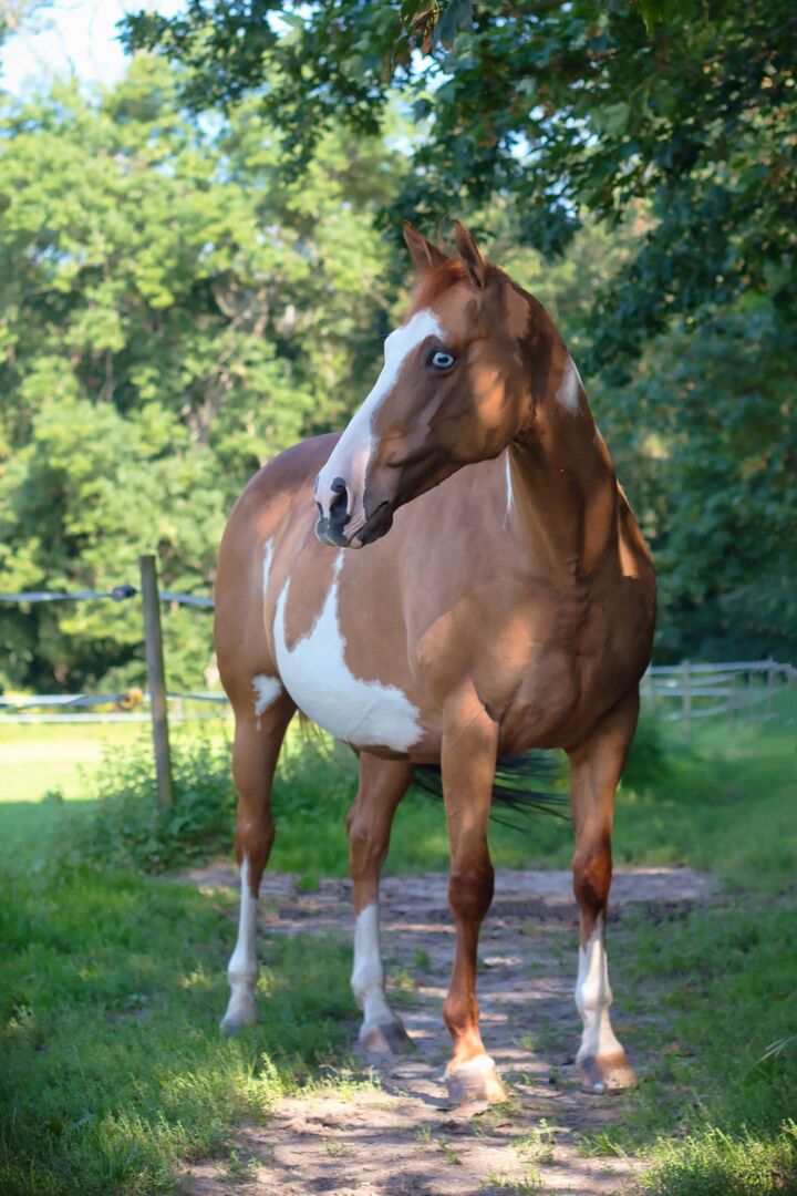 Schweren Herzens wegen absolutem Zeitmangel sucht diese bildhübsche Stute ein neues, für immer 5-Sterne Zuhause. Sie ist 2010 geboren und hat ein Stockmaß von 151 cm. Blue ist eine Paint Horse Mix Stute ohne Papiere. Sie fällt durch ihre tollen Zeichnung, ihrer Farbe (red dun-overo) und ihre beiden blauen Augen auf. Blue besitzt einen lieben Charakter und ist sehr personenbezogen, daher nicht für ständig wechselnde Reiter geeignet. Die Stute ist im Umgang sehr leicht und fein, bleibt beim Menschen und ist sehr kinderlieb. Blue kennt Offenstall und Boxenhaltung,. Kann in der Herde nur mit rangniedrigen Stuten zusammen stehen. Bisher immer fit. Sie ist unverbraucht, da 10-jährig erst angeritten. Vorher war sie Zuchtstute. Blue wurde freizeitmäßig Western geritten und geht super ins Gelände. Wenn sie ihrem Reiter vertraut, ist sie ein absolutes Verlasspferd. Sie ist ideal auch für nicht so fortgeschrittene Reiter. Aufgrund des Zeitmangels ist sie die letzten Wochen nicht geritten worden. Blue wird nur in allerbeste Hände abgegeben, wo sie den Rest ihres Lebens verbringen darf.