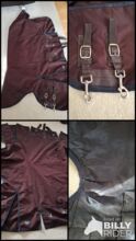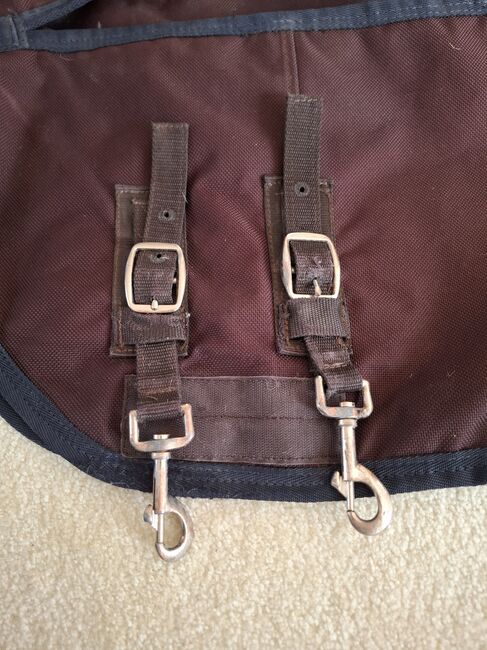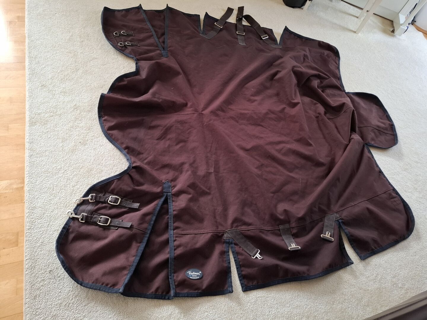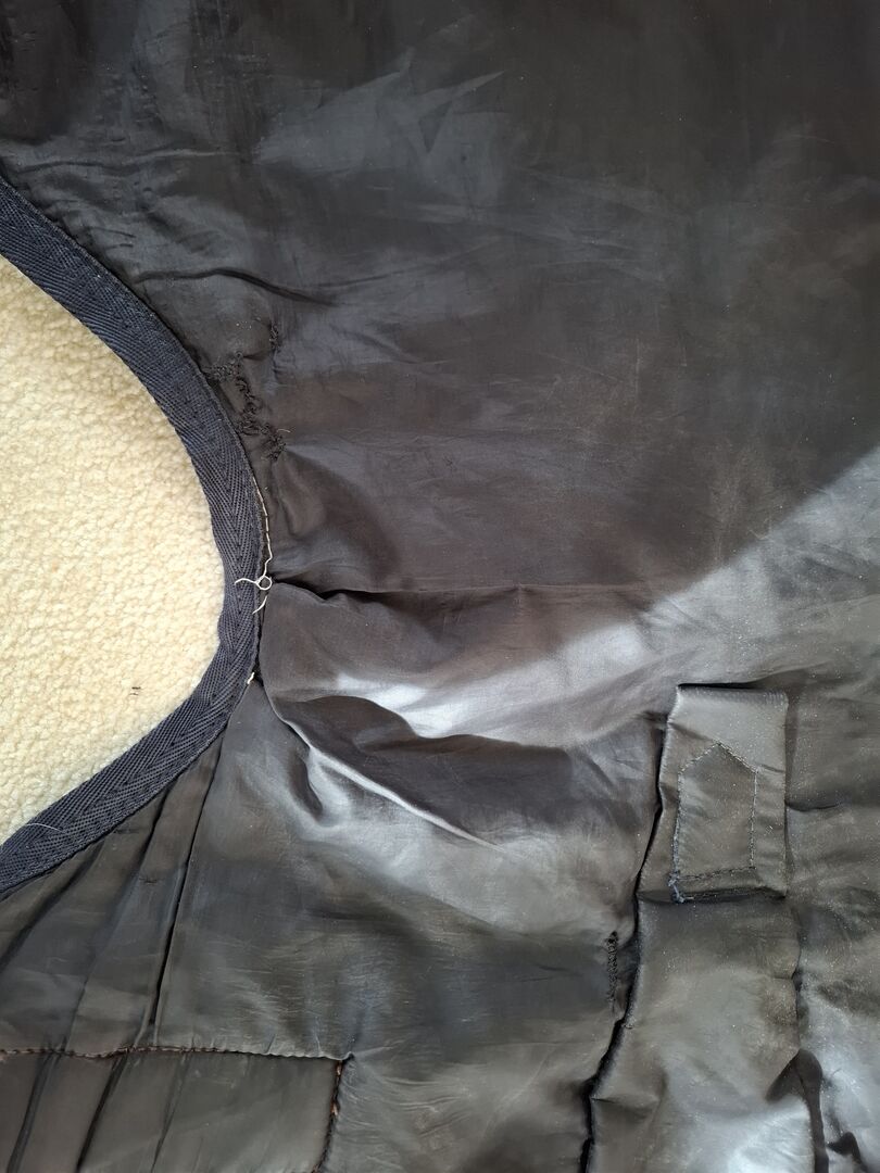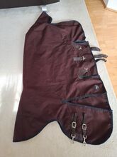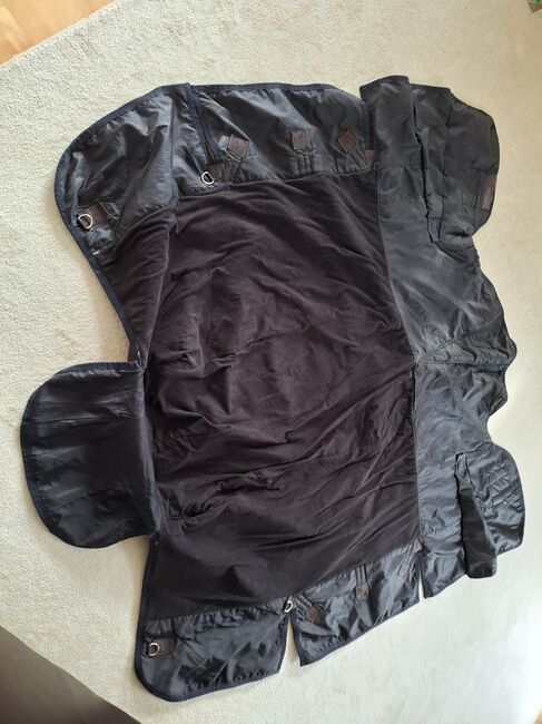 Es handelt sich um eine Fedimax Regendecke High-Neck Free moving 100 g Cooldry 1800 D (125 cm, Artikelnummer 13460, Neupreis 169 Euro). Die Decke ist in einem guten Zustand mit kleineren Gebrauchsspuren und besitzt noch alle Schnallen. Lediglich am Halsbereich war das Innenfutter etwas verletzt. Beide Stellen (etwa 3 cm) habe ich genäht. Die Decke ist wasserdicht.