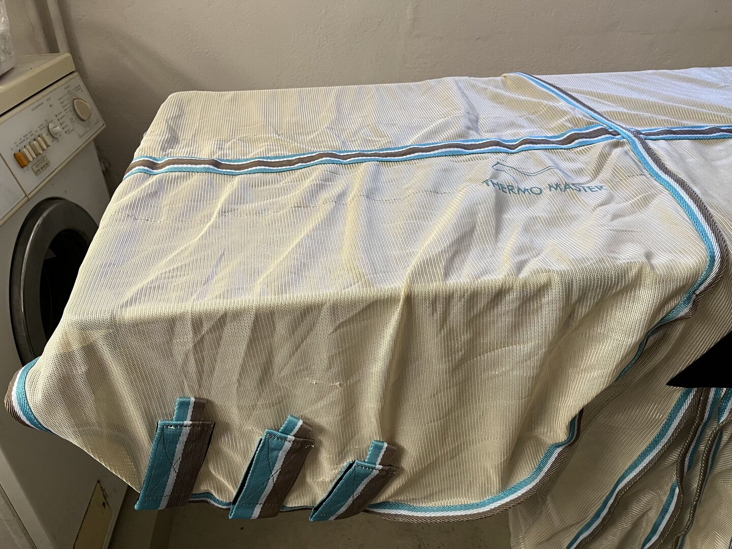 ich verkaufe eine Fliegendecke mit festem Halsteil von ThermoMaster in Größe 155. Die Decke wurde 2019 gekauft, lag dann einige Jahre nur im Schrank und passt nun nicht mehr. War also nur zur Anprobe am Pferd (selbst das Schild ist noch dran). Die Farbe ist Sand, also hell, damit es im Sommer nicht zu warm unter der Decke wird. Halsteil, Brustbereich und Schweiatz sind gegen Scheuerstelle mit glattem Futter unterlegt.