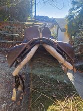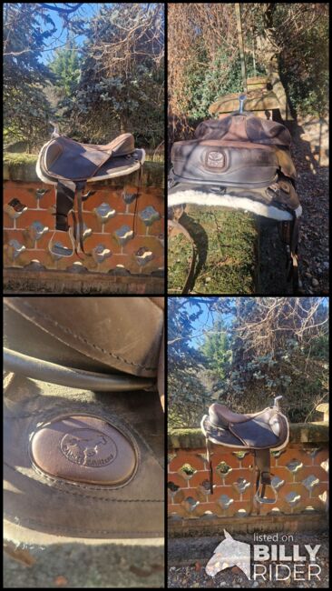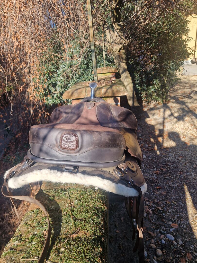 Ghost USA Westernsattel - Ich verkaufe meinen Ghost USA baumlosen Westernsattel. Hergestellt aus braunem Leder, der Sitz ist aus synthetischem Wildleder. Ich verkaufe ihn mit seiner eigenen Satteldecke, edix tiamo kurzen Kotflügeln und Steigbügeln. Ich kann es versenden oder Sie können es in Piemont, Italien abholen