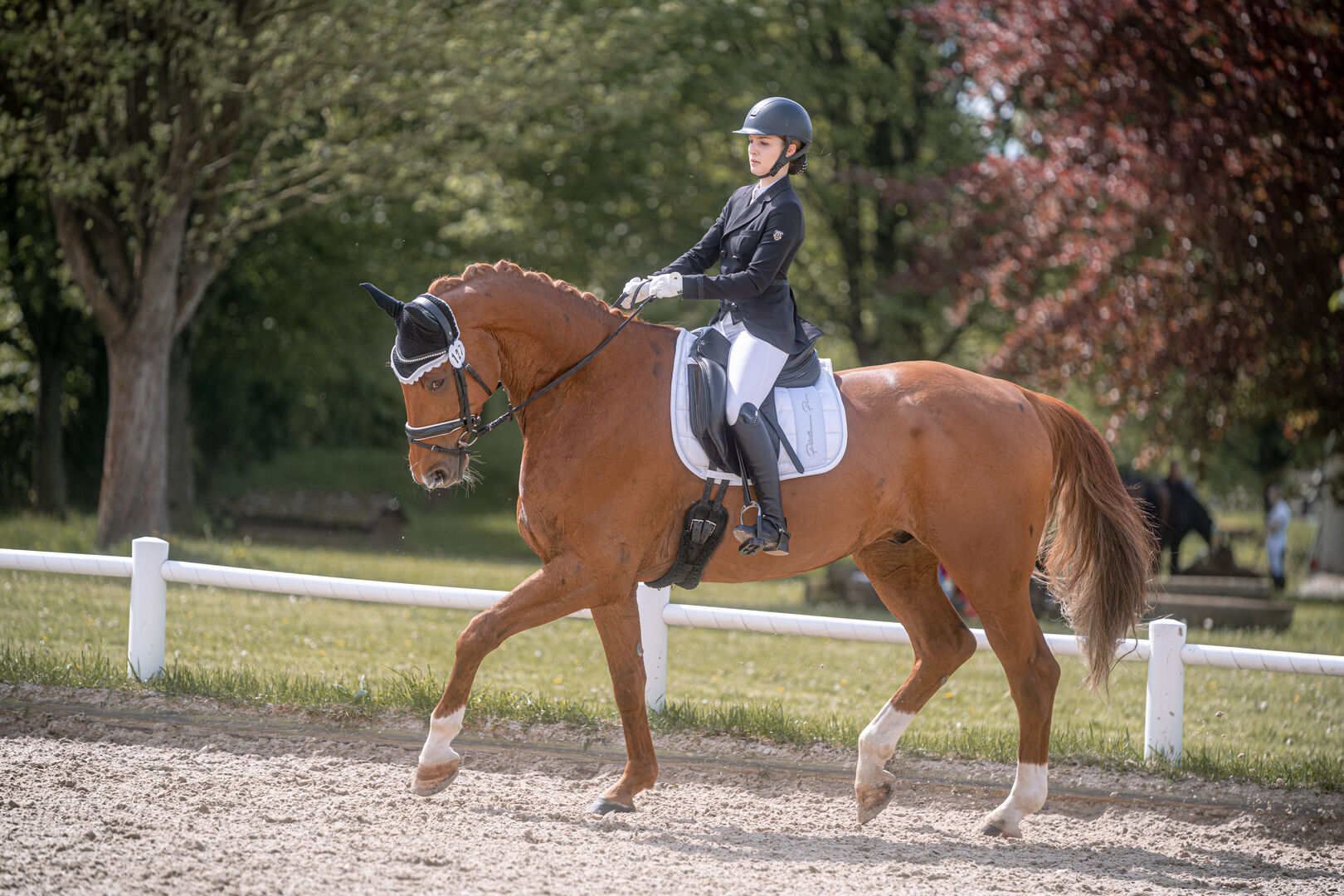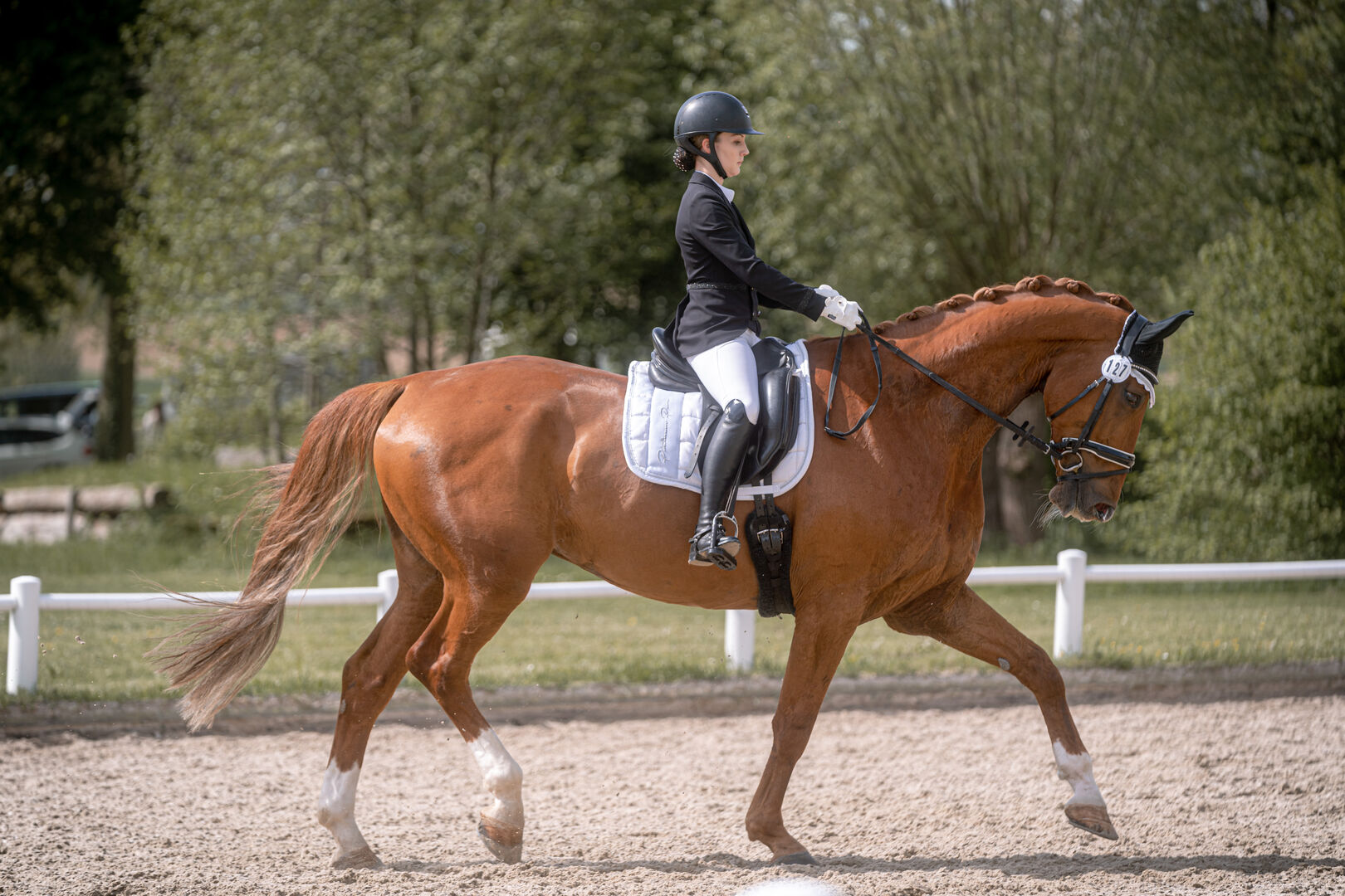 Unter dem Sattel befindet er sich auf sicherem, hohem L-Niveau, Tendenz zu M. Fliegende Wechsel wurden bereits geritten. Auf Turnieren ist er bis L hoch platziert.