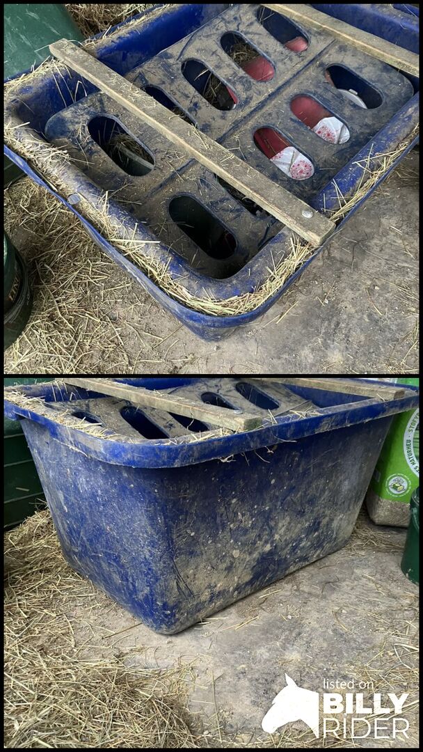 Abholung am Stall in Heiden. Der Original-Einschiebedeckel ging kaputt; stattdessen halten zwei Holzstreben die Fressbremse. Das funktioniert genauso gut wie der originale Deckel und das Fressgitter lässt sich sogar noch besser ein- und ausbauen.