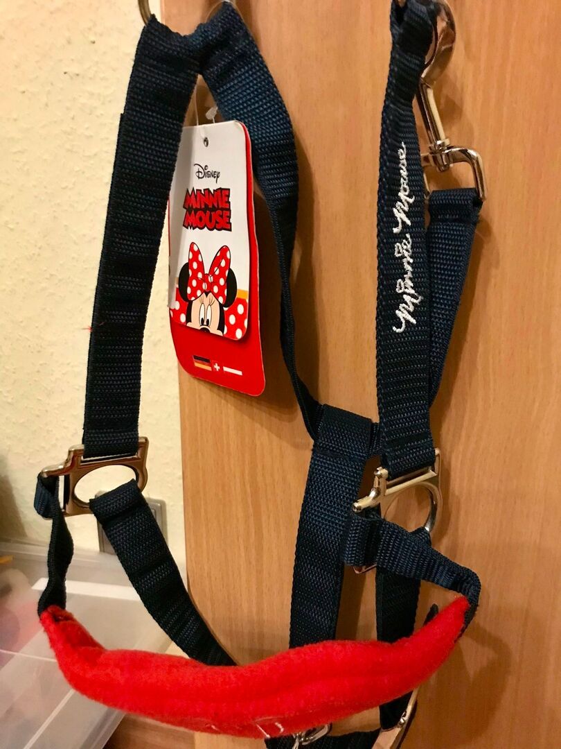Unbenutztes, mit dickem Fleece unterlegtes Halfter mit Minnie Mouse Motiv. Es ist dunkelblau mit rotem Fleece und ist beidseitig verstellbar. Größe: Warmblut Versand gegen Kostenübernahme möglich.