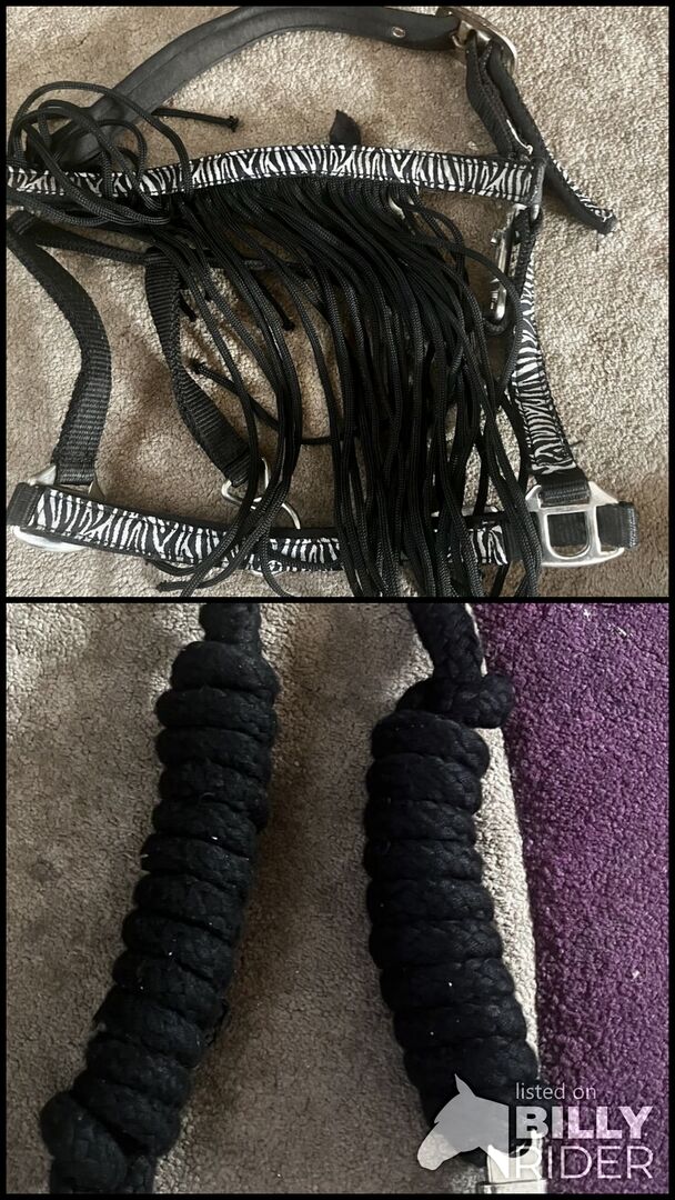 Zebradruck Kopfkragen in Ponygröße mit abnehmbarem Fliegenschleier und schwarzem Führstrick