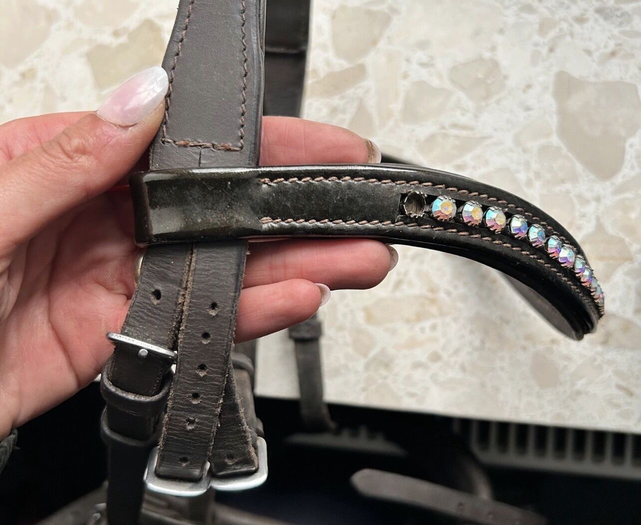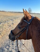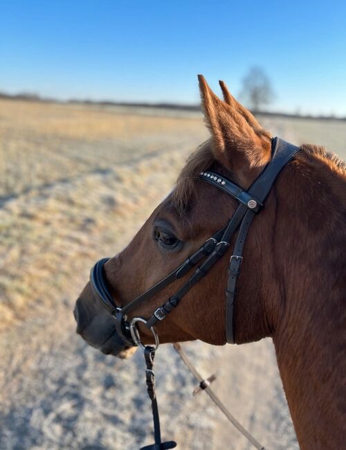 Trense mit hannoverschem Reithalfter. Das Reithalfter ist mit Lack sowie der Stirnriemen. In dem Stirnriemen fehlt ein Stein, fällt aber kaum auf. Ohne Zügel.
